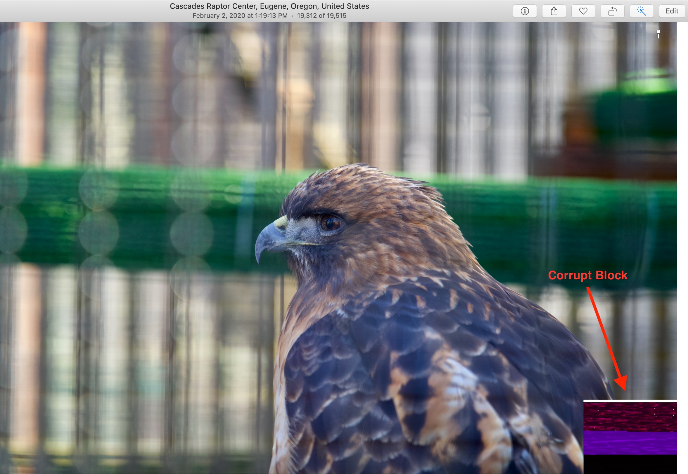 The corruption does go away when entering edit mode (or rotating the image and then rotating back). But, then after closing Photos and re-opening the app the corruption appears again. Hinting that it is an issue with the way thumbnails are being displayed or generated?