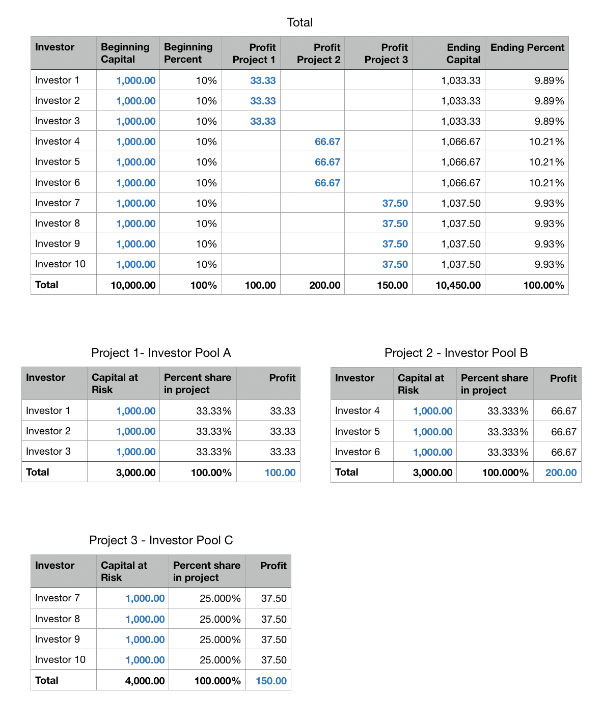 I need to make this happen because in my example I have a total investment amount for a person. this converts to a percentage base on what the total of all the peoples investments are. when a new project finishes and there is a profit, I use their percentage to calculate their share of the profit. After this, their share of the profit adds to their total investment amount, more or less a running total. Is there anyway to do this?