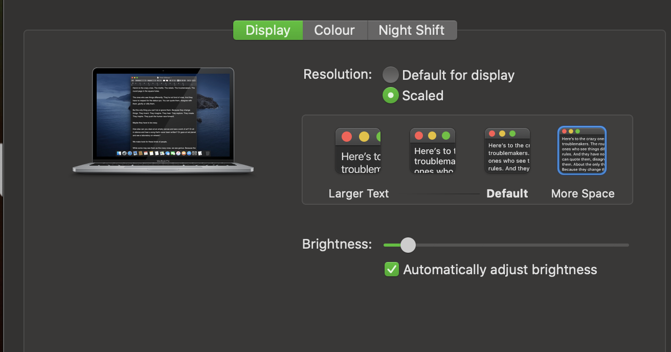I'm happy to share that I've found the solution to the problem! The answer to this problem is to simply go to the 'Display' tab and check 'Scaled' option instead of 'Default for display'. Then, simply select whichever option fits you better. Once you select one, the display will reset automatically and you'll be having the correct display profile along with Night Shift working again. Magic!