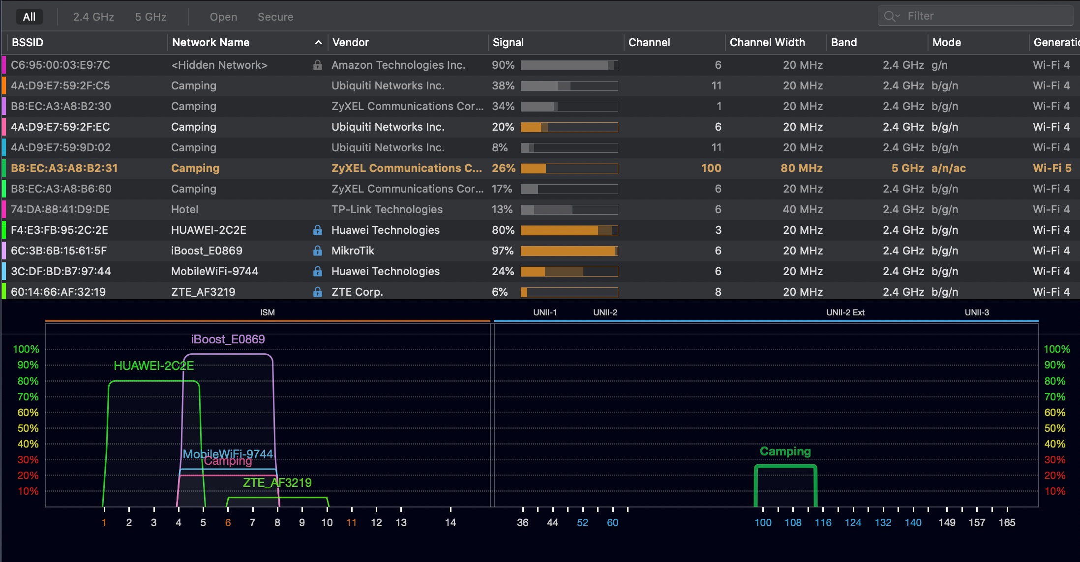 The two ZyXEL Routers on channel 1 and channel 100 have M.A.C. numbers that are sequential, so they are likely coming from one Physical router.