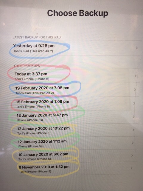 Pardon my interruption, but this find is very enlightening. I have been told by one of the ASC hosts that iCloud saves the two most recent backups for each device but I have never seen evidence of it until now.