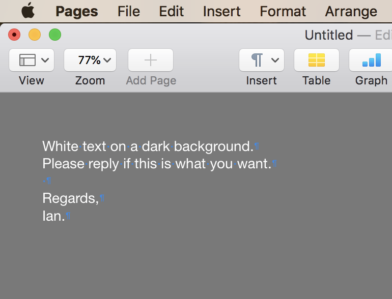 Even in Dark mode, the Pages document itself is still white, and nothing you can do about it. LibreOffice Writer allows one to change the body text background to black and the text color if that is a goal.