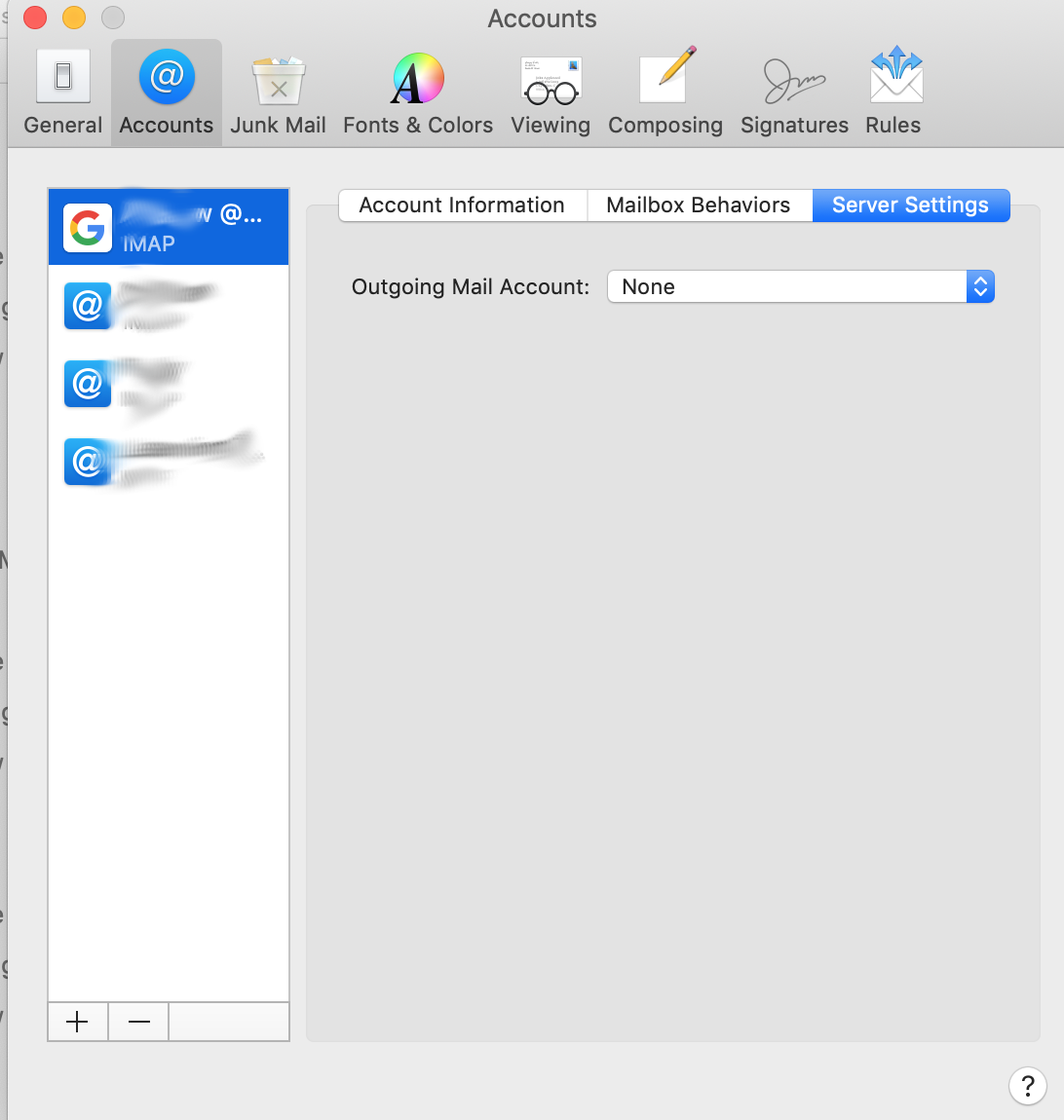One of my email accounts stopped synchronizing. It is a Gmail account. I went into my account preferences to check the settings and update them if necessary, and lo and behold, the Server Settings didn't show any options for incoming mail and it was missing most of the options for outgoing mail settings. Yikes! See screen shot below.