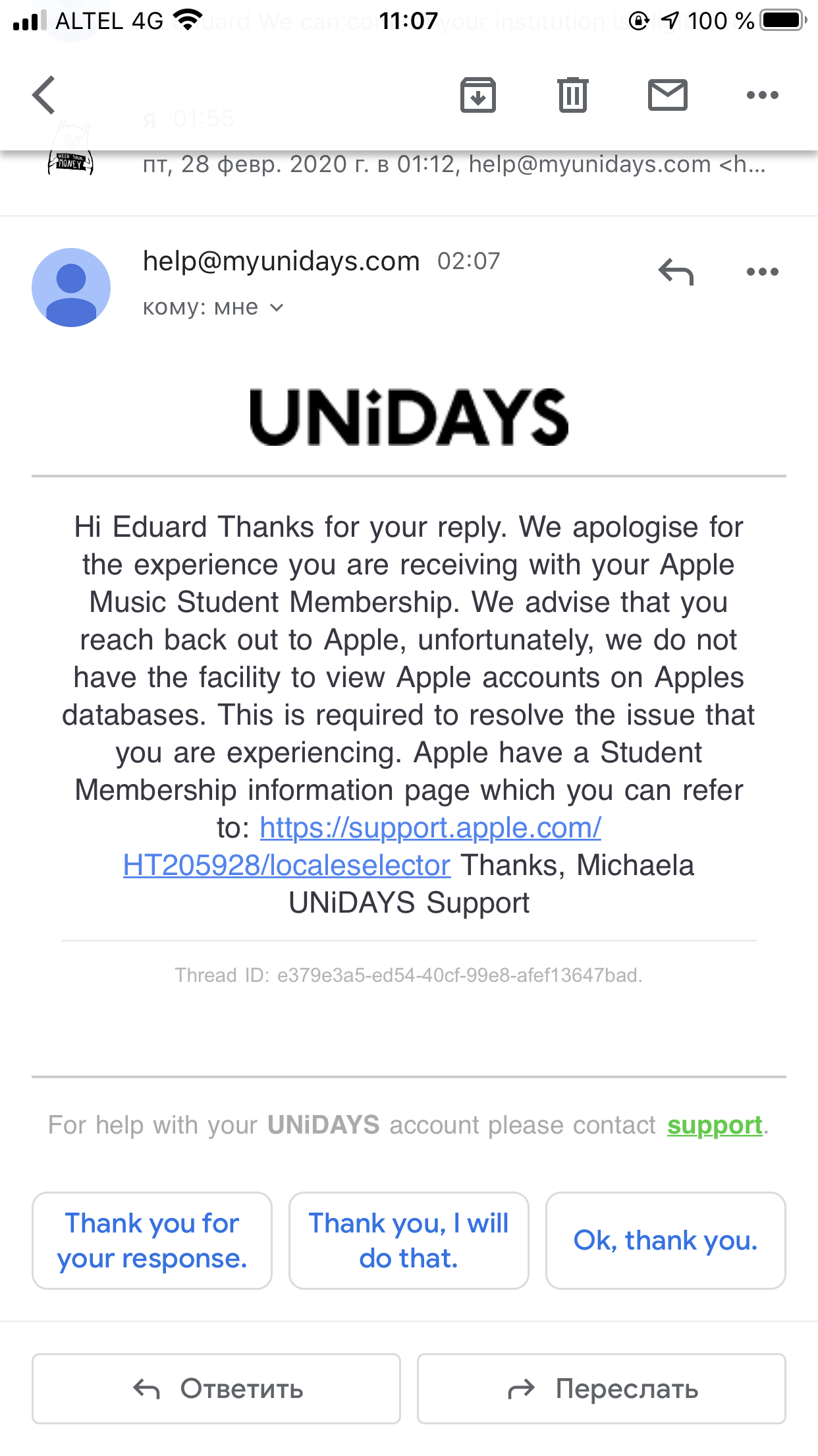 I wrote to Unidays support, they said I need to contact Apple support with this problem