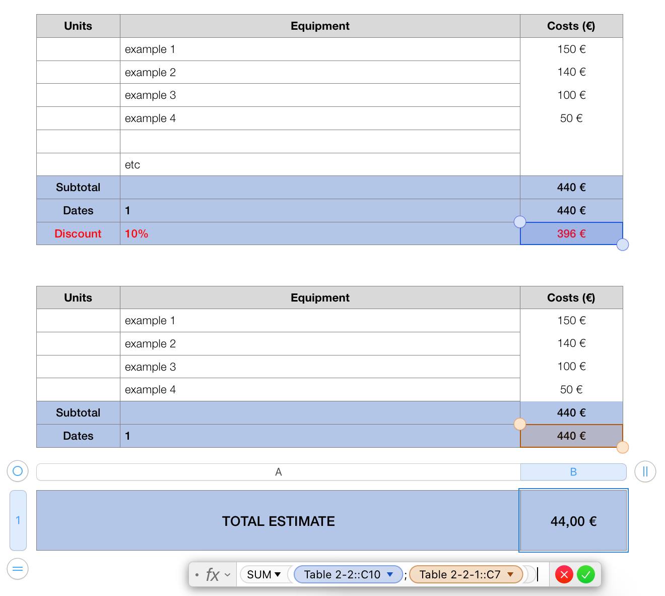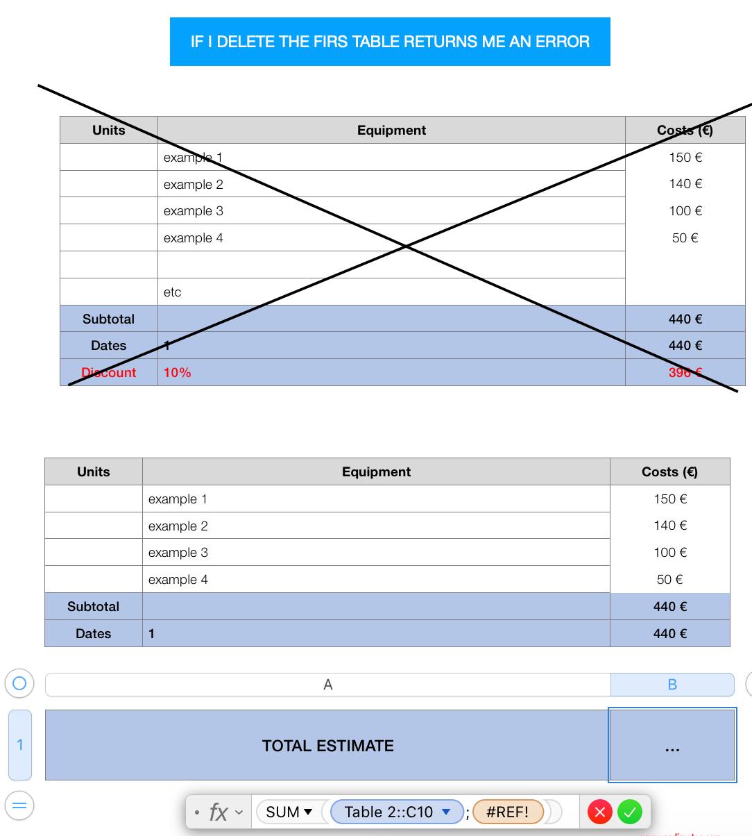 1. In pages I have created several tables with calculations (sum) of prices and discount at the end . In the last table I just want to add the SUM of each above table but the calculation is wrong see image below..