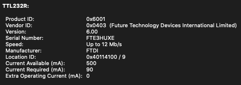 In terminal doing "ls /dev" it shows up as tty.usbserial-FTE3HUXE