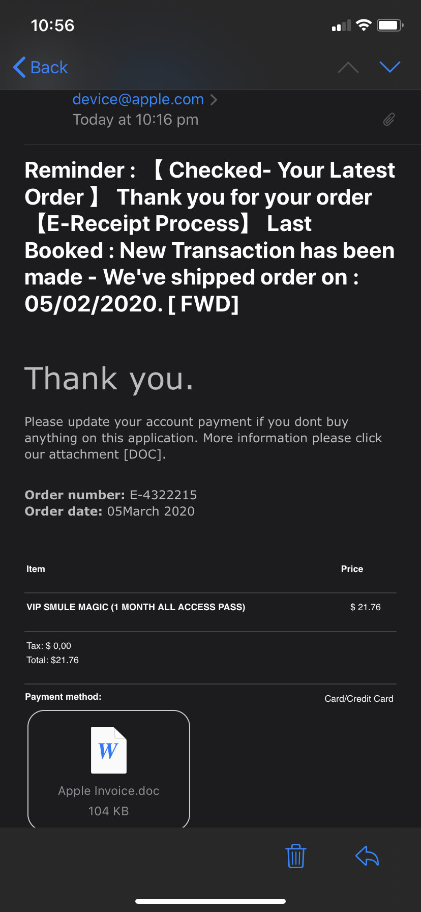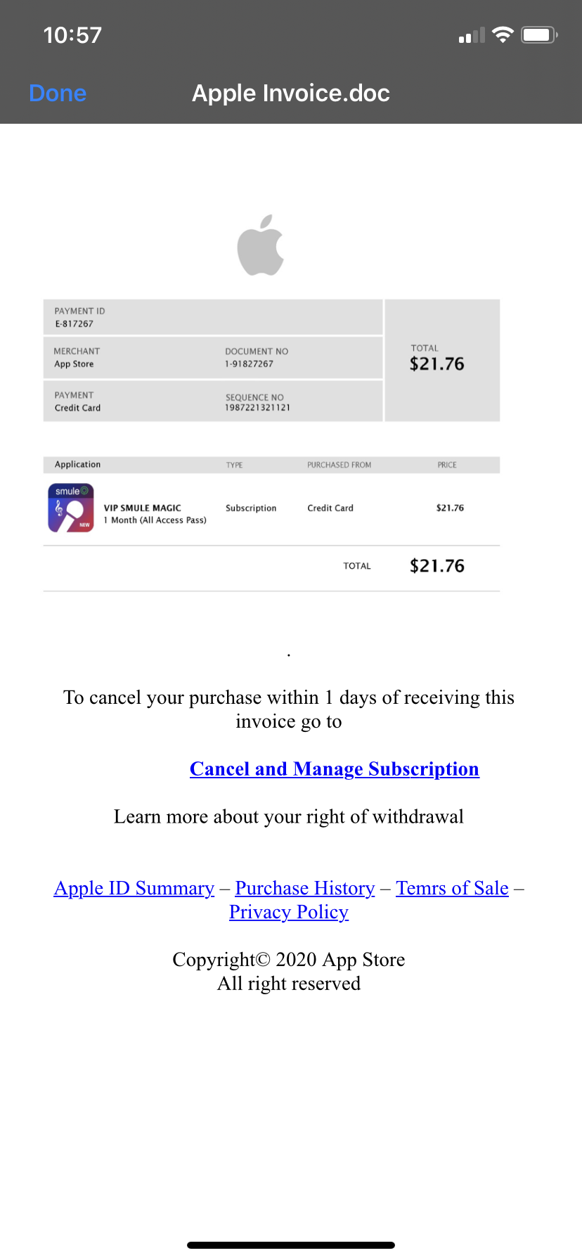 I keep receiving emails from Apple telling that I have purchased ‘VIP Smule Magic’ but I have never owned the app, it’s saying the email is from Apple and that I should click a link if I want to cancel within 1 day?