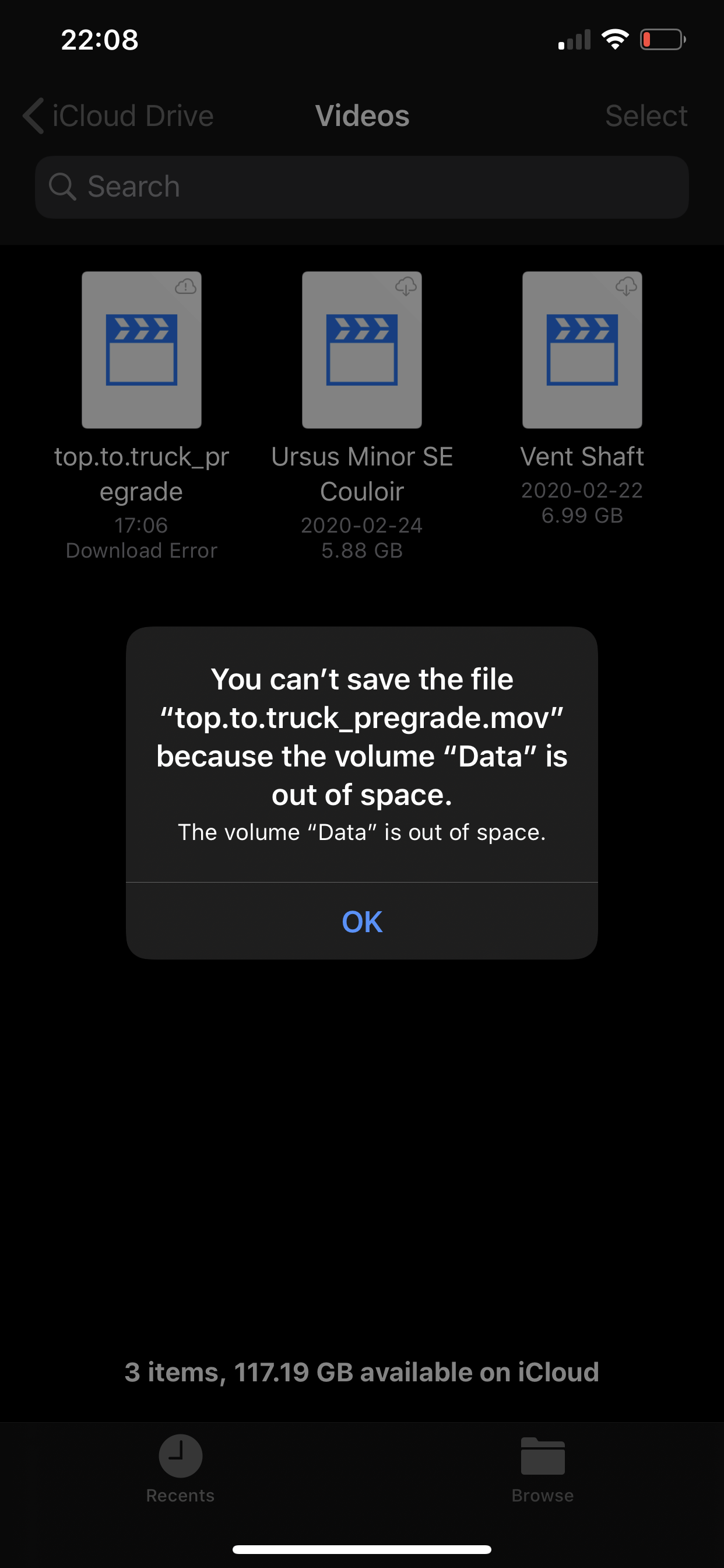 When trying to download a 3.52 gb file to my iPhone off iCloud it comes up with a message saying “the volume ‘data’ is out of space” but my phone says it has over 20gb of space left on it.