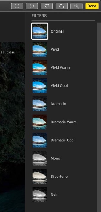 I am aware of the adjustment sliders that are available in both iOS and MacOS Photos. What I'm talking about is the Filter slider that is available on the iPhone, so that I can tone down the effect of the filter. On the Mac, that slider is not shown. I would have to select Adjustments, then slide the different options rather than the single slider under Filters.