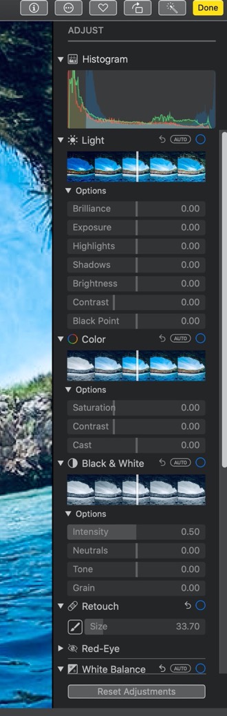 I am aware of the adjustment sliders that are available in both iOS and MacOS Photos. What I'm talking about is the Filter slider that is available on the iPhone, so that I can tone down the effect of the filter. On the Mac, that slider is not shown. I would have to select Adjustments, then slide the different options rather than the single slider under Filters.