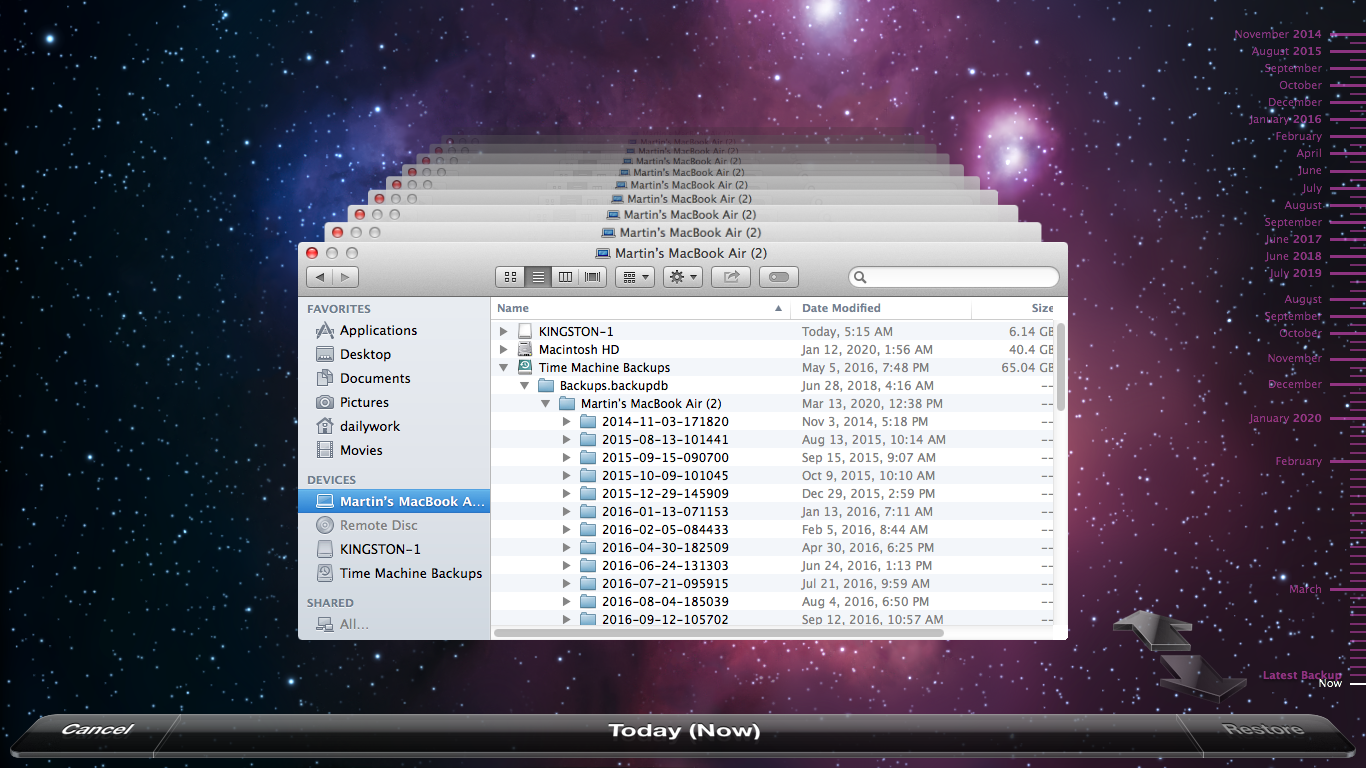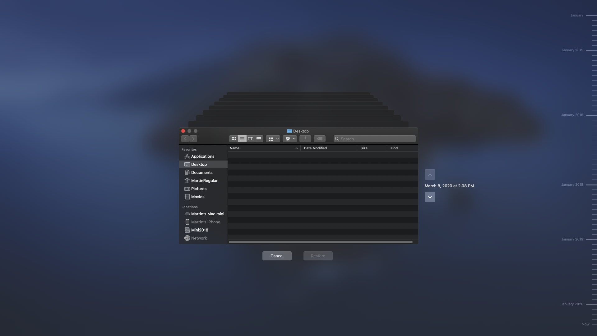 Then the install of 10.15.3 and blank directories, grayed out disk images. A couple days later, no dates visible to scroll at right of screen when Enter Time Machine -- for any of the devices. IDK how but Catalina seemed to modify the entire Time Capsule directory of bundles, blocking (or possibly corrupting) hundreds of backups of the older non-Catalina devices, too.