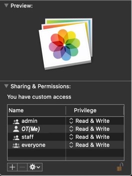 In the pane go to the Permissions and Ownership section and set Read and Write to you, everyone, the group that's there and admin. If no admin is present add it.