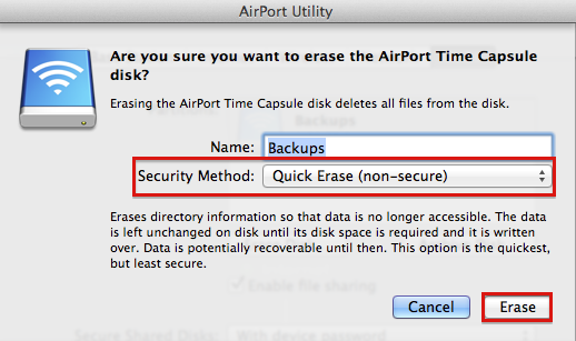 That's basically it. When you click Erase Disk, another window will open with different options to erase the disk. Choose the Quick Erase option, then click Erase. It will only take a few minutes to erase the Time Capsule. In the example below, my Time Capsule disk is named Backups. Your disk is likely named Data, unless you have changed the name of the drive.
