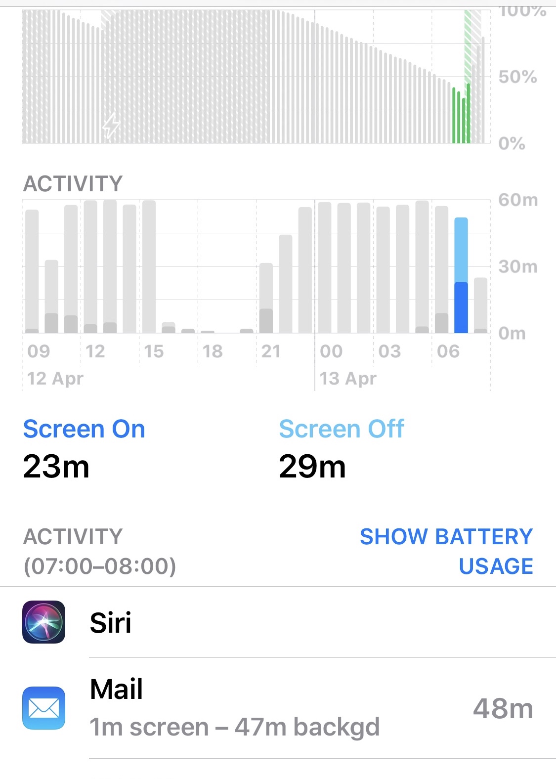 As soon as Mail was reinstalled at around 21:30 the activity rocketed again showing between 48 and 59 minutes per hour! All mail accounts had been removed so no fetching of data and high wifi usage, so you’d think - this is just because the app merely ‘exists’ on the phone!