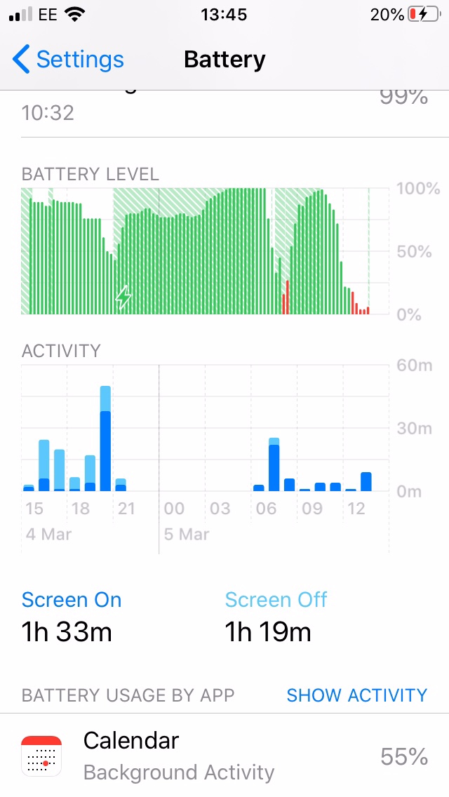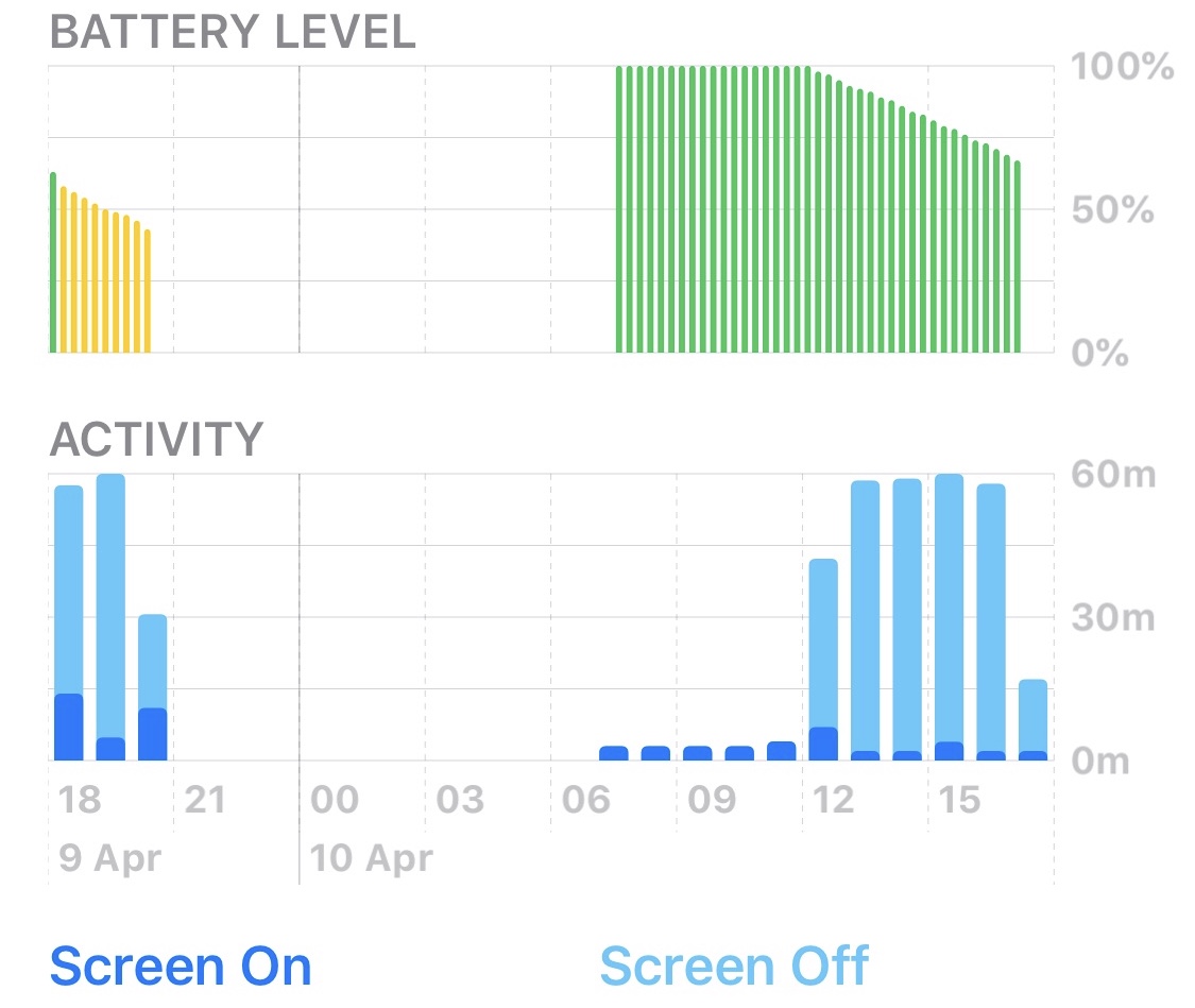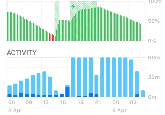Ios 13.4.1 was installed where the graph starts on the left, you can see the battery level droppi ng as soon as it was installed. The graph then shows it charging and again dropping like a stone. Interestingly, I wonder why the light blue bars have shot up so high...