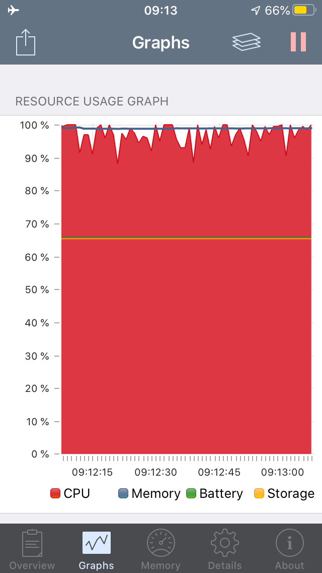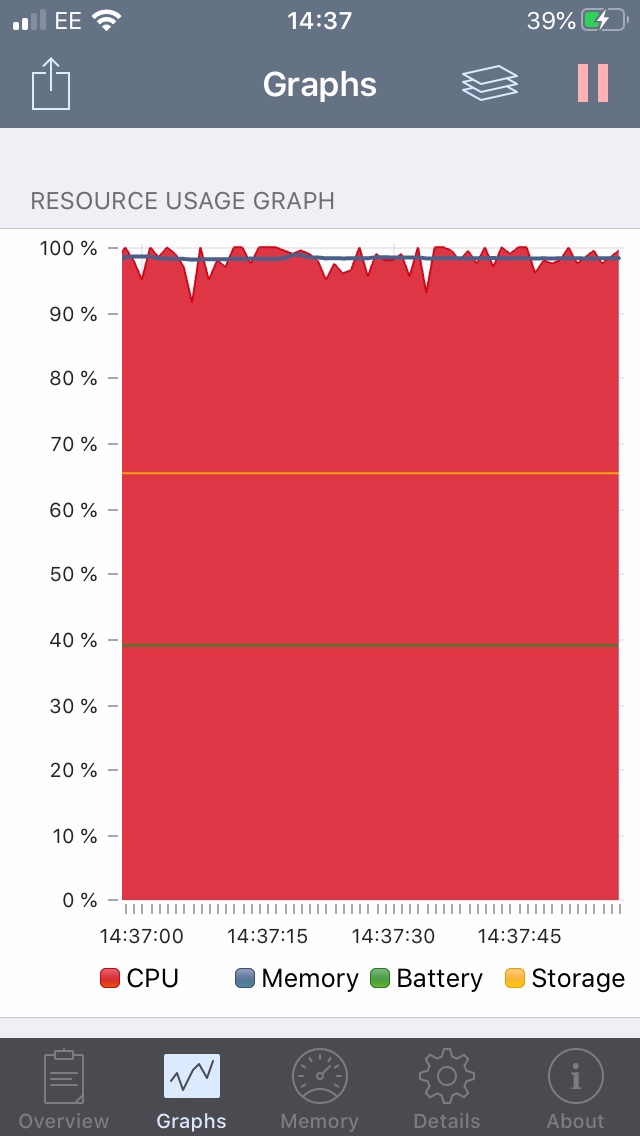 If I run the same test on my old iPad mini on IOS12 then the cpu is at about 45% & memory at 70%. Luckily for me its not able to run 13.