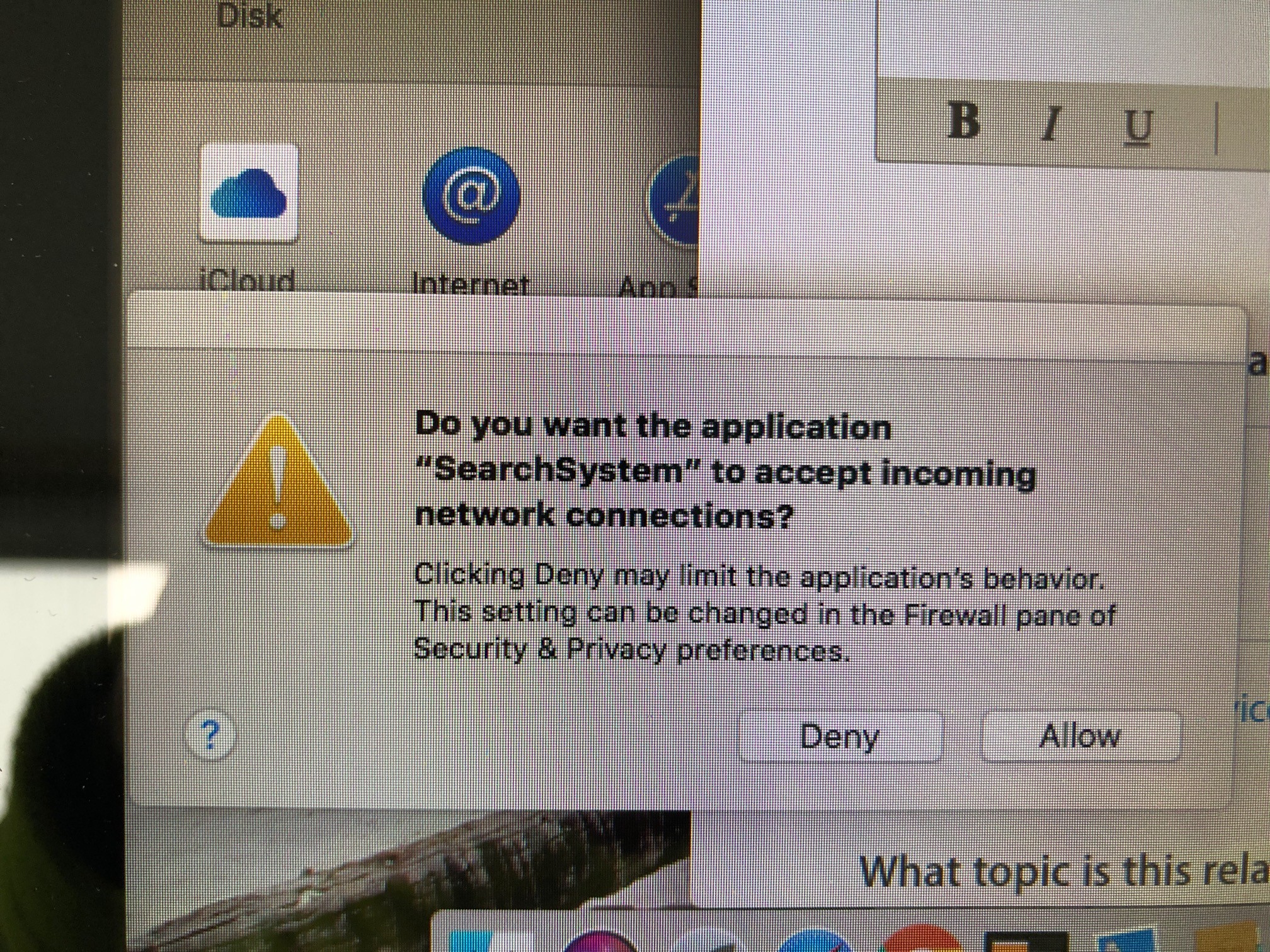I keep getting a pop up window that says "Do you want the application "SearchSystem" to accept incoming network connections ?