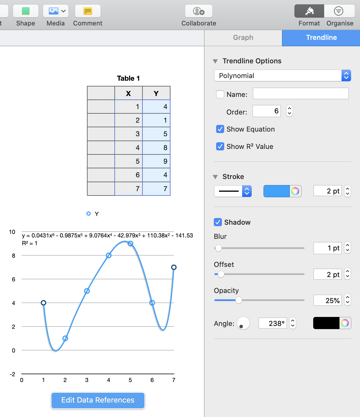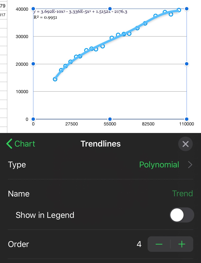 I'm using 5th and 6th-order polynomial trendlines in my chart. I have displayed the equation, but it only shows up to an x^4 term. For 3rd order, it shows x^3..x^0 terms, for 4th order, it shows x^4..x^0 terms. These are as expected, but for 5th order and 6th order, it still shows only x^4..x^0 terms. The coefficients on these terms change, so the underlying trendline equation is changing, and the trendline curve on my chart fits my data better, but it's not showing the higher-order coefficients. I'm thinking this is a bug, but before I send Apple feedback, I thought I'd ask here.