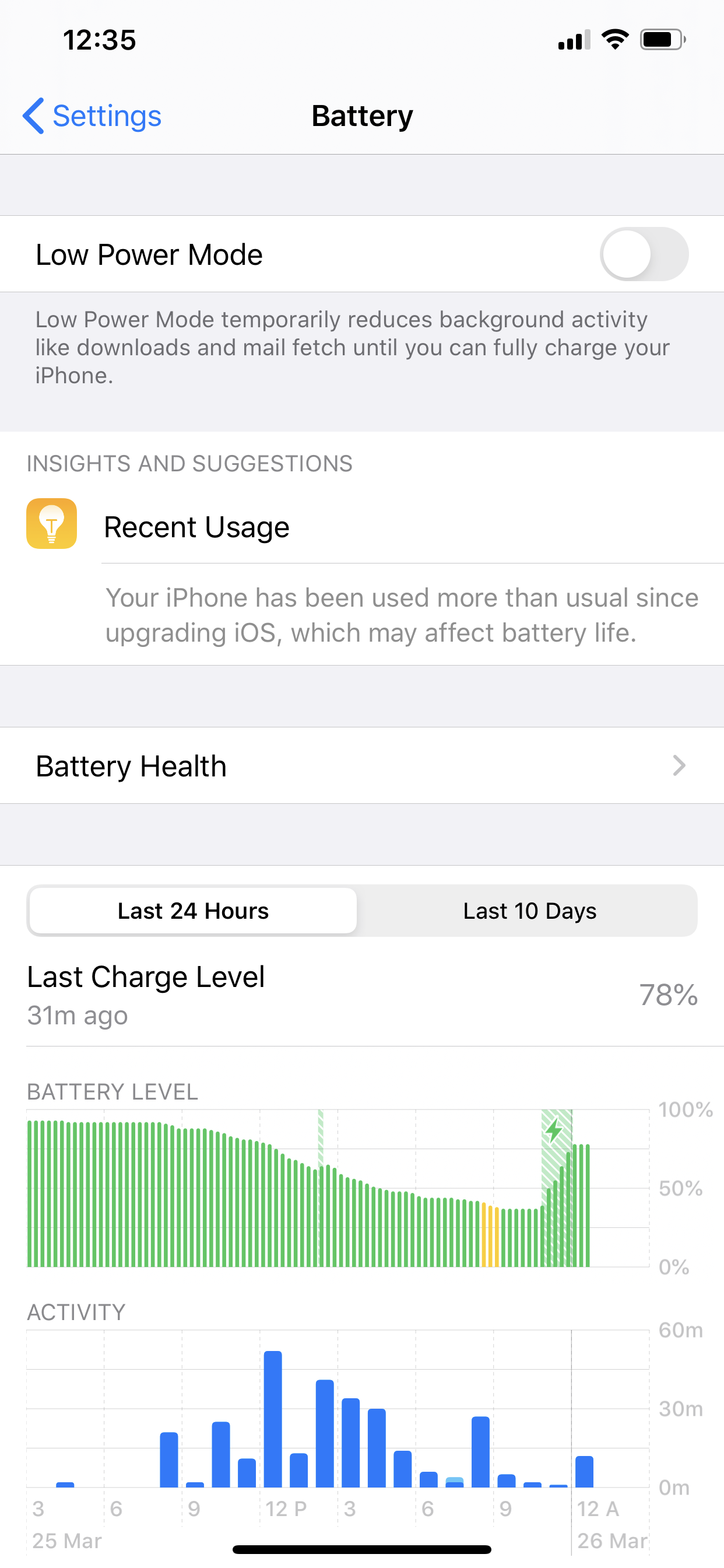 i really disappointed by the new update 13.4. Really bad for battery. Even i not use and even i off all backgrounds activity but battery auto drain and see in chart it show little blue dots in graphs and today give me suggestion message too, see in attached screenshots