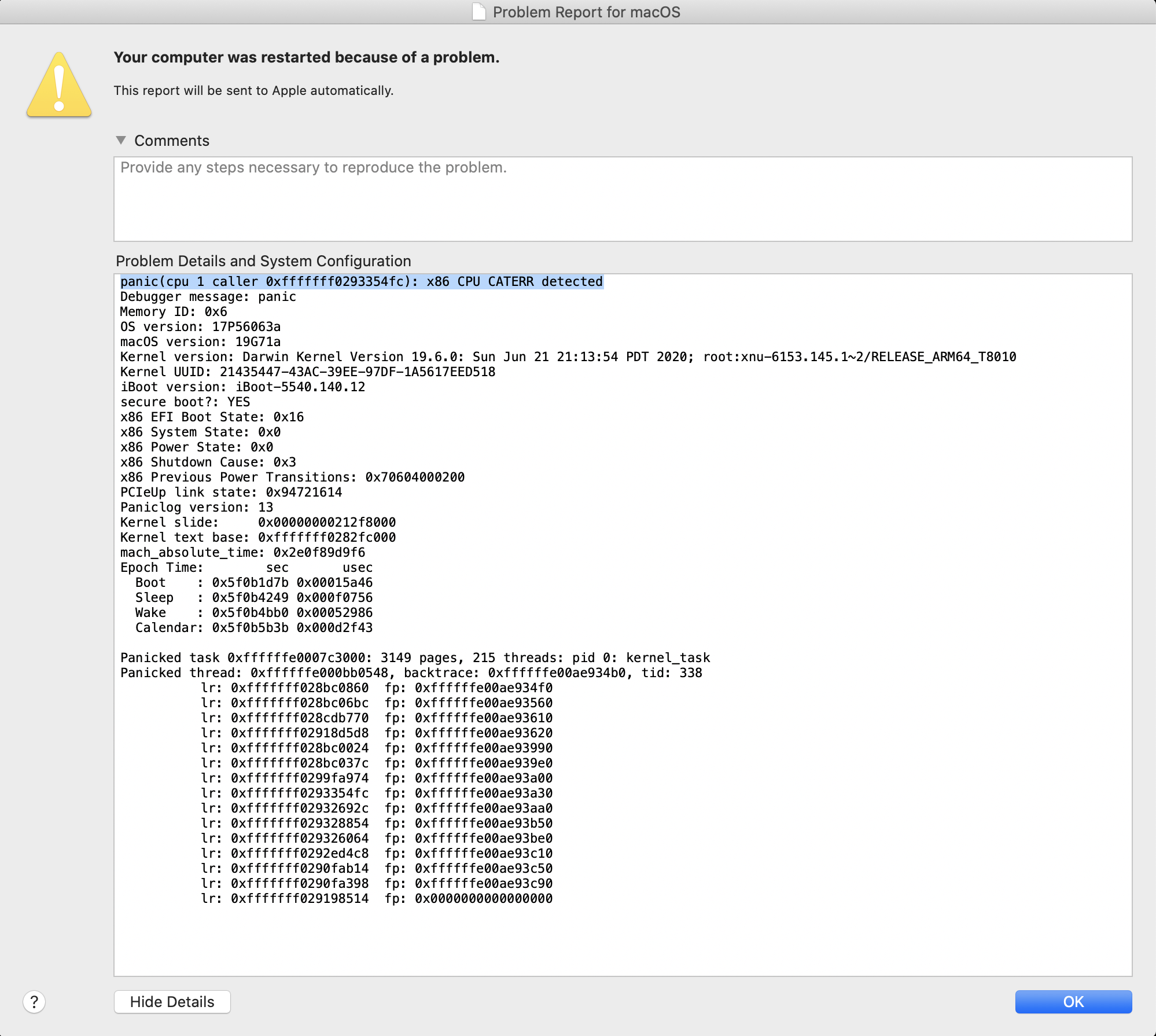 Mac OS 10.15.4: Random restarts due to panic(cpu 1 caller