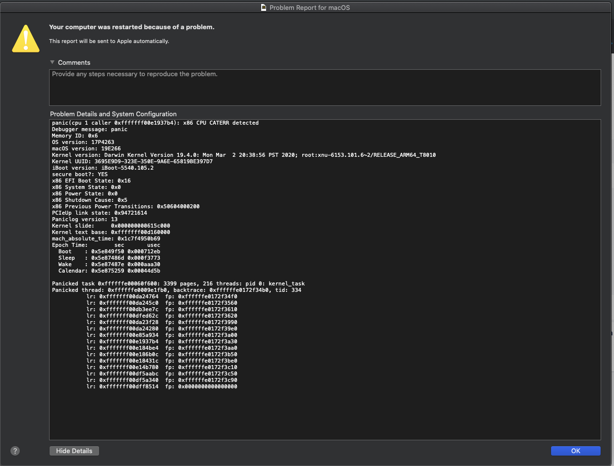 Mac OS 10.15.4: Random restarts due to panic(cpu 1 caller
