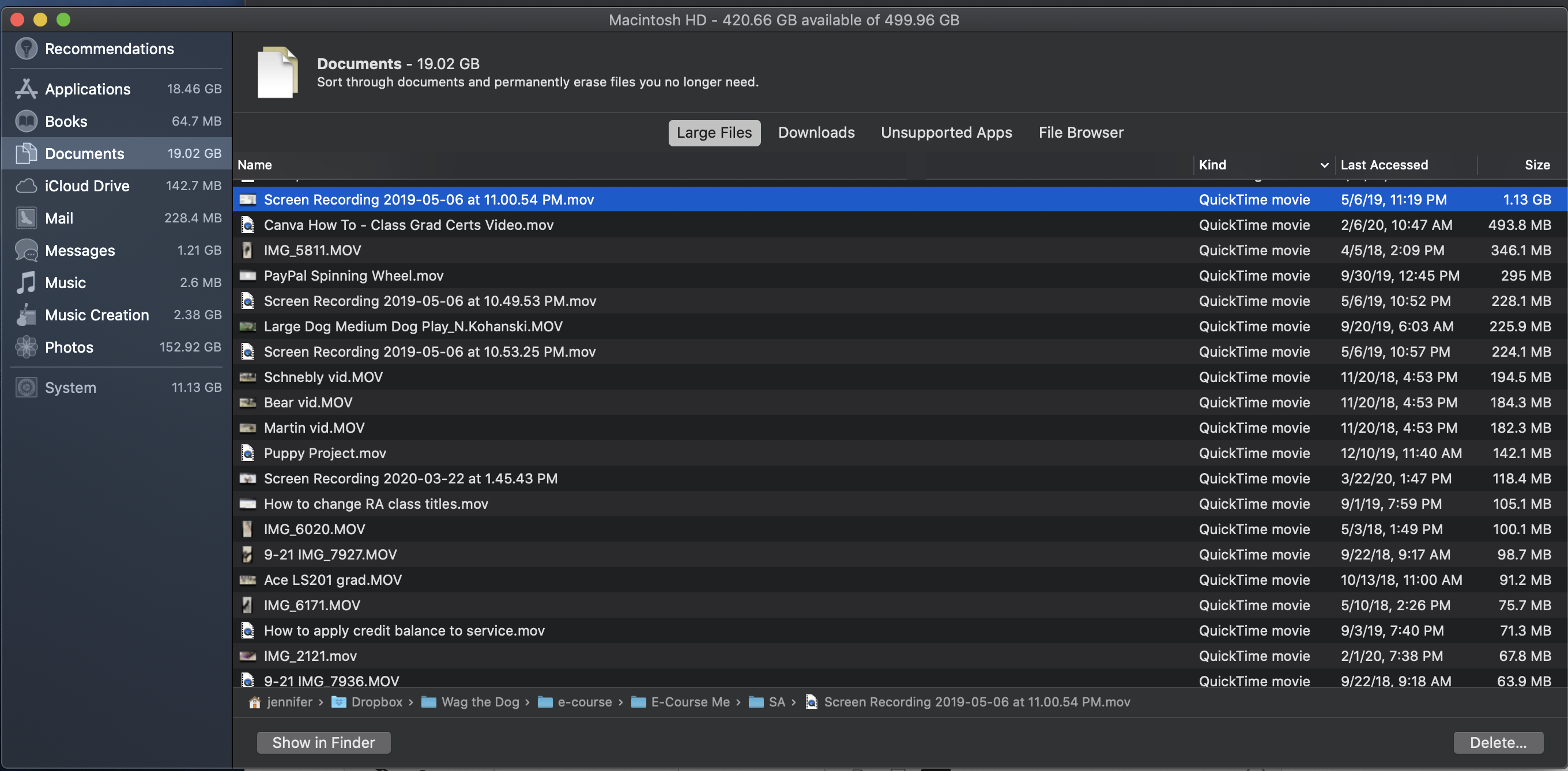 When I am looking at my 'Large Files' I see that I have several that are QuickTime movies or MPeg-4 movie files among others that are also saved in my Dropbox. I have my Dropbox Smart Sync set up to reduce the files I have for quick access on my computer. So they are NOT saved anywhere on my hard drive and are only supposed to be accessible if I open DropBox in my browser.