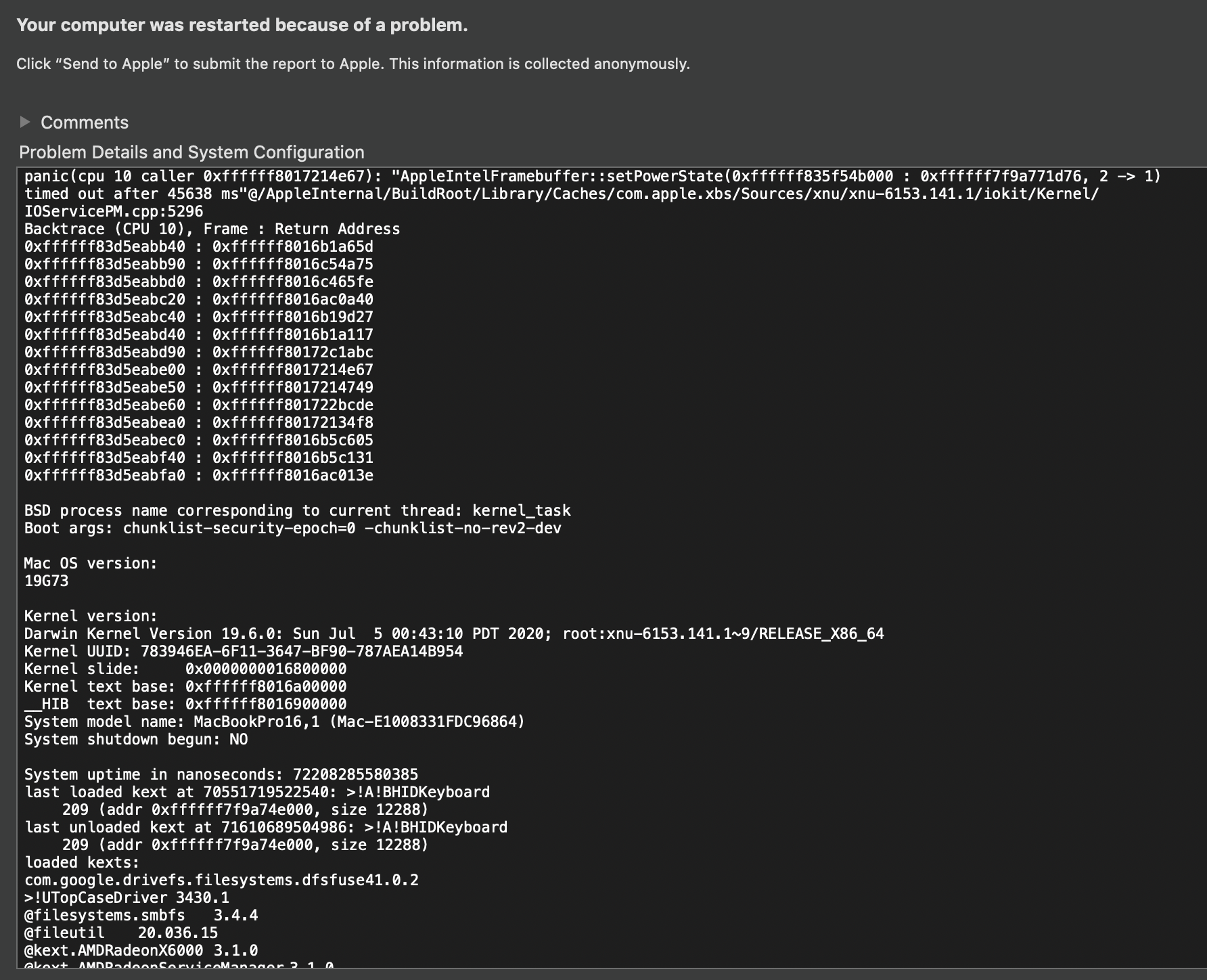 ANYONE else having a problem with their MacBook Pro going to sleep then crashing? EVERY single day for 4 days now this prompt comes up that says "Your computer was restarted because of a problem." I Purchased a fully loaded 16" MacBook Pro January 2020. A $5000.00 Computer. I have had NOTHING but issue since. The report begins with panic(cpu 0 caller 0xffffff8004a91b2c): Sleep transition timed out after 180 seconds while calling power state change callbacks. Suspected bundle: com.apple.iokit.IOGraphicsFamily. Thread 0x1fbc0. After searching I see 582 people have this same problem...REALLY APPLE? Suggestions were made to others who called apple support and they reinstalled their entire systems, reinstalled this, reinstalled that...I don't know about anyone else but I don't have time for all of that nonsense ESPECIALLY after spending $5k on a computer. Finally I found where a person requested the logic board to be replaced and the issue stopped. If Apple can't get their quality assurance in check I will be spending my money elsewhere. I want this computer replaced.