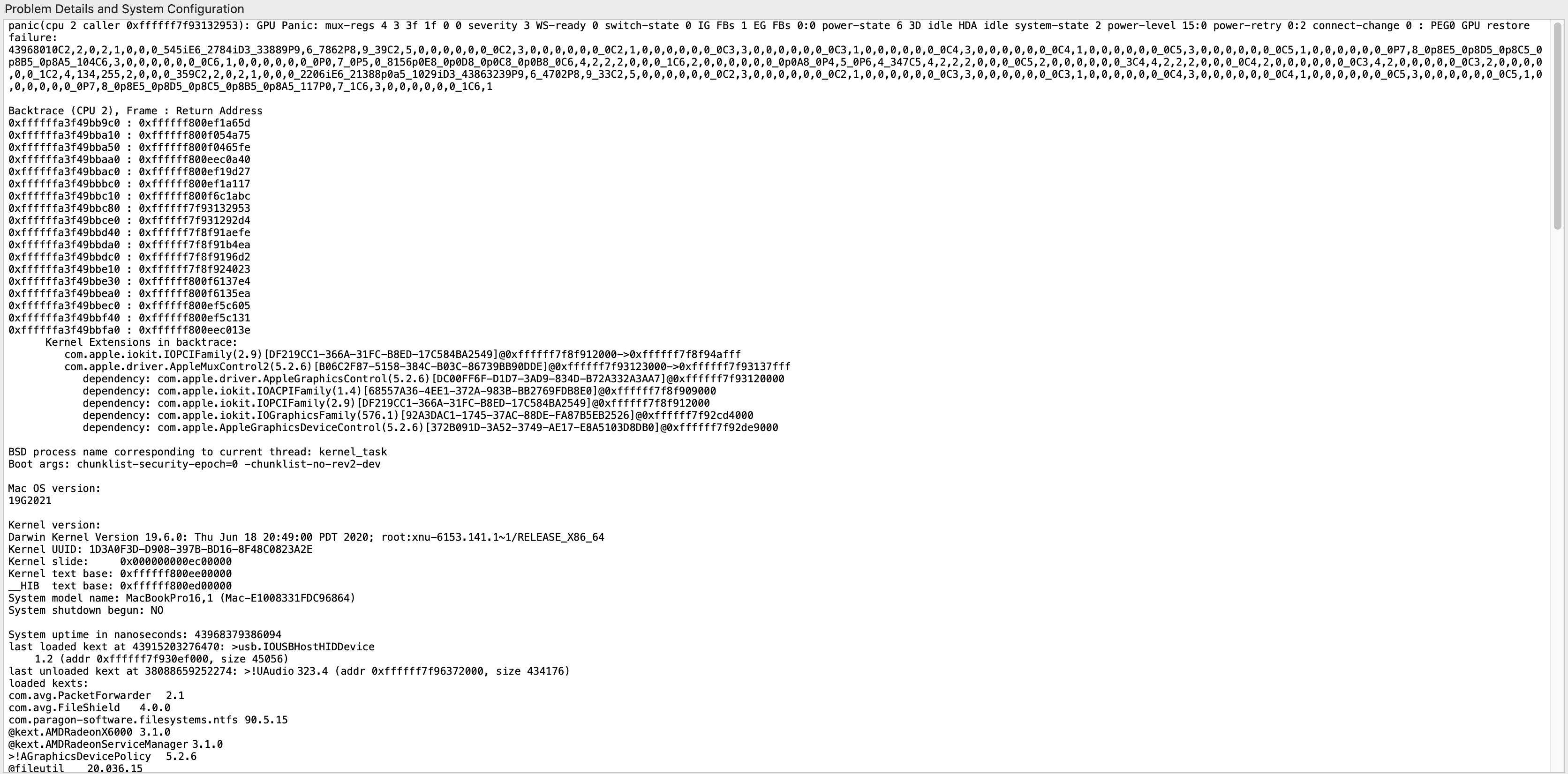 panic(cpu 11 caller 0xffffff800284b27c): "Machine Check at 0xffffff800285d143, registers:\n" "CR0: 0x000000008001003b, CR2: 0x000000010a52c000, CR3: 0x0000000016d8b000, CR4: 0x00000000003626e0\n" "RAX: 0x0000000000000060, RBX: 0x0000000000000016, RCX: 0x0000000000000001, RDX: 0x0000000000000000\n" "RSP: 0xffffff81d1ed3ef0, RBP: 0xffffff81d1ed3f20, RSI: 0xffffff80031f7680, RDI: 0xffffff80030584c0\n" "R8: 0x0000000000000000, R9: 0x0000000000000010, R10: 0x0000000000000001, R11: 0xffffff80031f5280\n" "R12: 0x0000000000000060, R13: 0x000000000a3e89b2, R14: 0x00001d87dfcc3f76, R15: 0x000000000000000b\n" "RFL: 0x0000000000000046, RIP: 0xffffff800285d143, CS: 0x0000000000000008, SS: 0x0000000000000000\n" "Error code: 0x0000000000000000\n"@/AppleInternal/BuildRoot/Library/Caches/com.apple.xbs/Sources/xnu/xnu-6153.121.2/osfmk/i386/trap_native.c:168