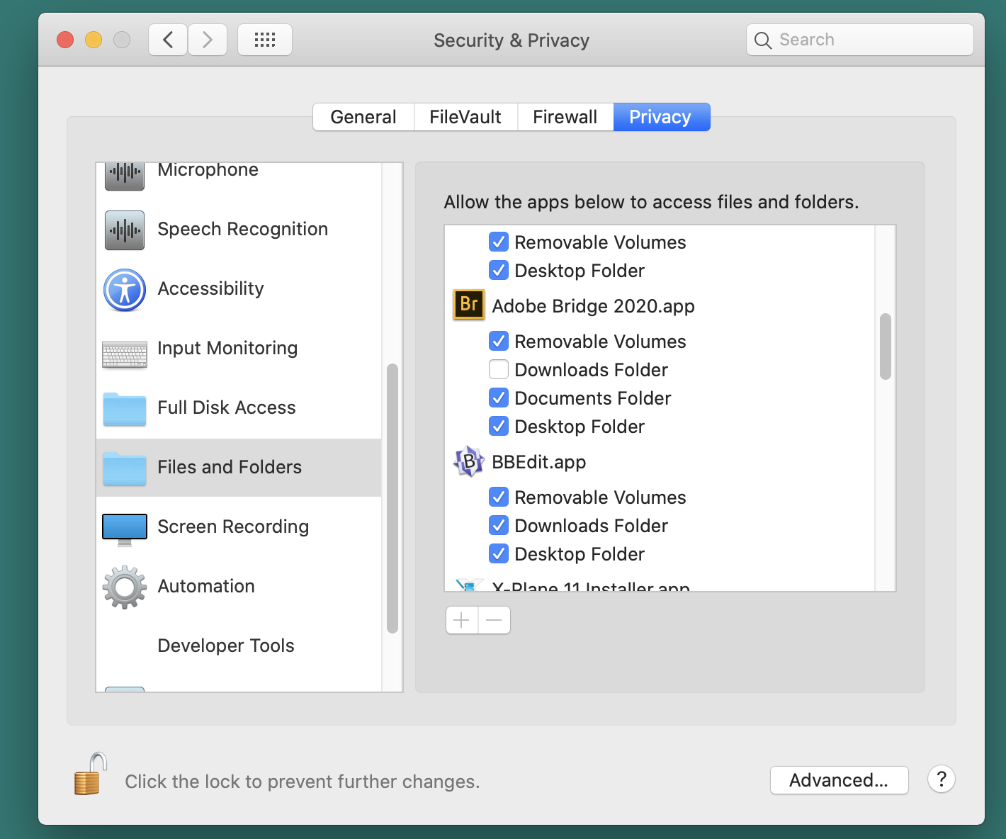 Also, and I had noticed this a couple of weeks ago, but did not do anything, under the Security & Privacy settings > Privacy > Files and Folders, I am unable to add nor delete (clicking on an application name does not highlight it) or even uncheck items under the application name.