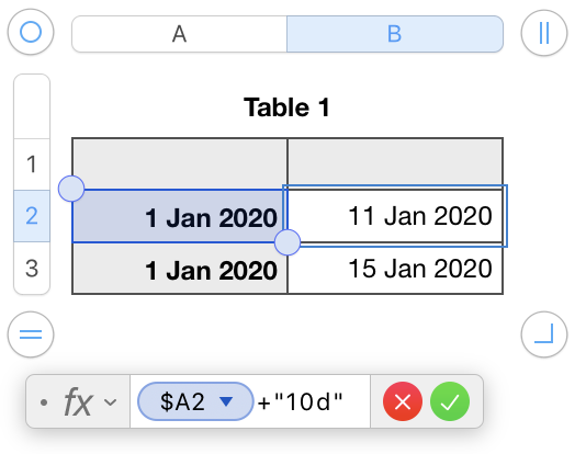 In cell A2 of the new, single column table, enter the starting date shown in A1 of the main table. In A3, type= to open the formula browser, then enter the formula A2+5 (this assumes you'll have a 10 day difference between the numbers along the axis). Click the green check to confirm the formula and close the browser.