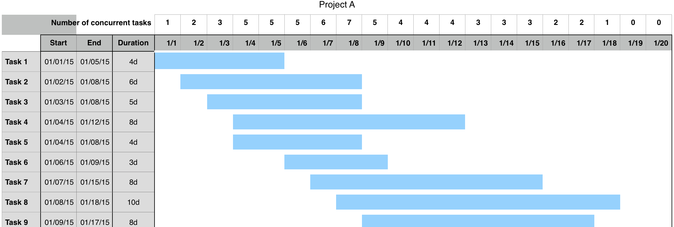 A1 contains the date on which the project starts. This is used in all calculations in column D of the table