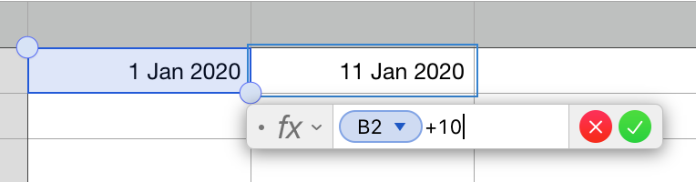 In cell A2 of the new, single column table, enter the starting date shown in A1 of the main table. In A3, type= to open the formula browser, then enter the formula A2+5 (this assumes you'll have a 10 day difference between the numbers along the axis). Click the green check to confirm the formula and close the browser.