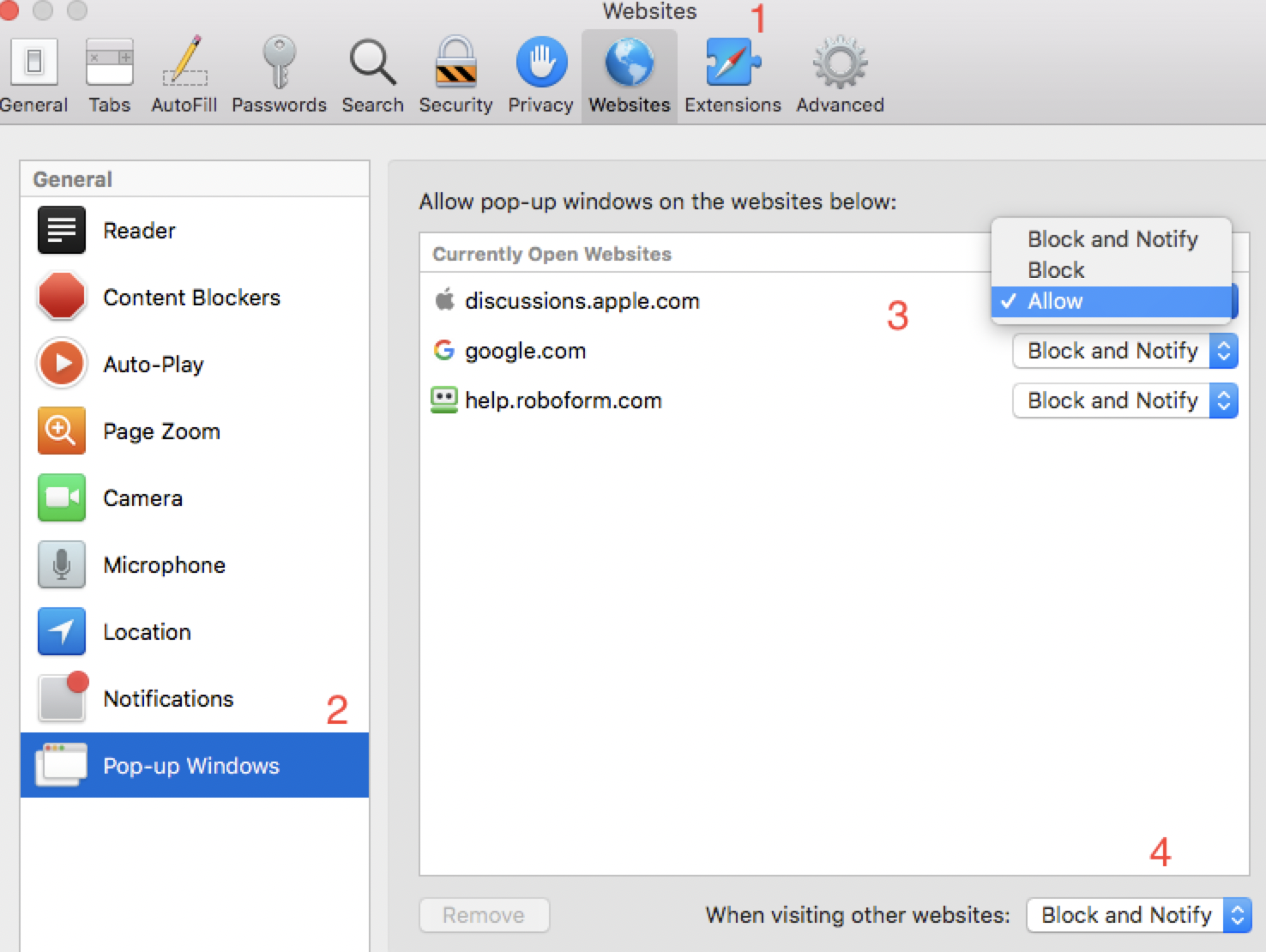 2. Safari > Preferences > (1) Websites > (2) Pop-up windows