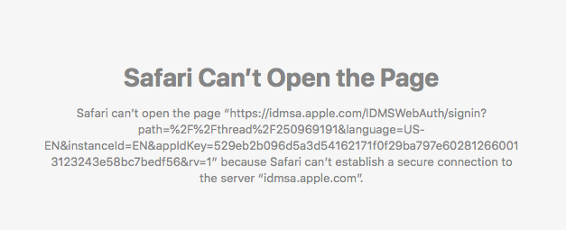 I get the attached screenshot message when I try to use Apple support in any way. I have a feeling there is a server connection error in general via Safari but am unable to go further with this.