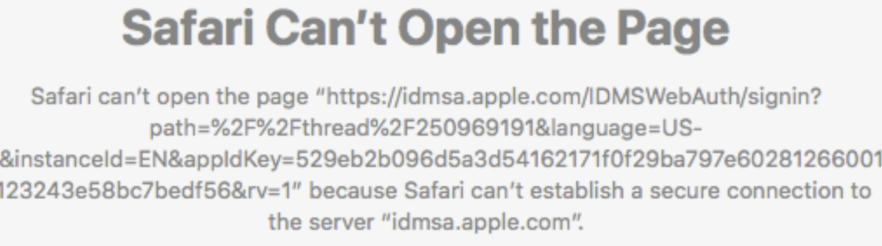 I get the attached screenshot message when I try to use Apple support in any way. I have a feeling there is a server connection error in general via Safari but am unable to go further with this.