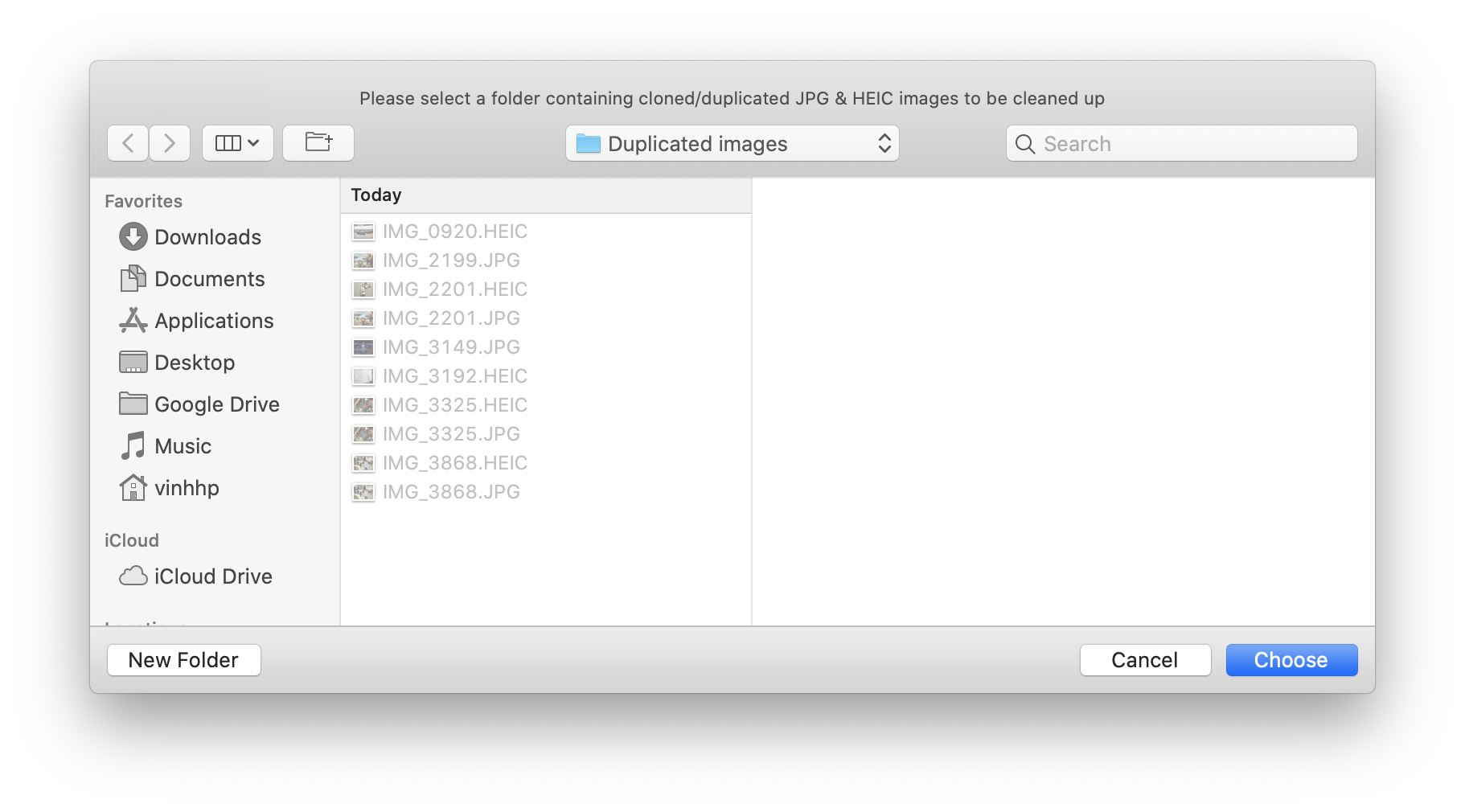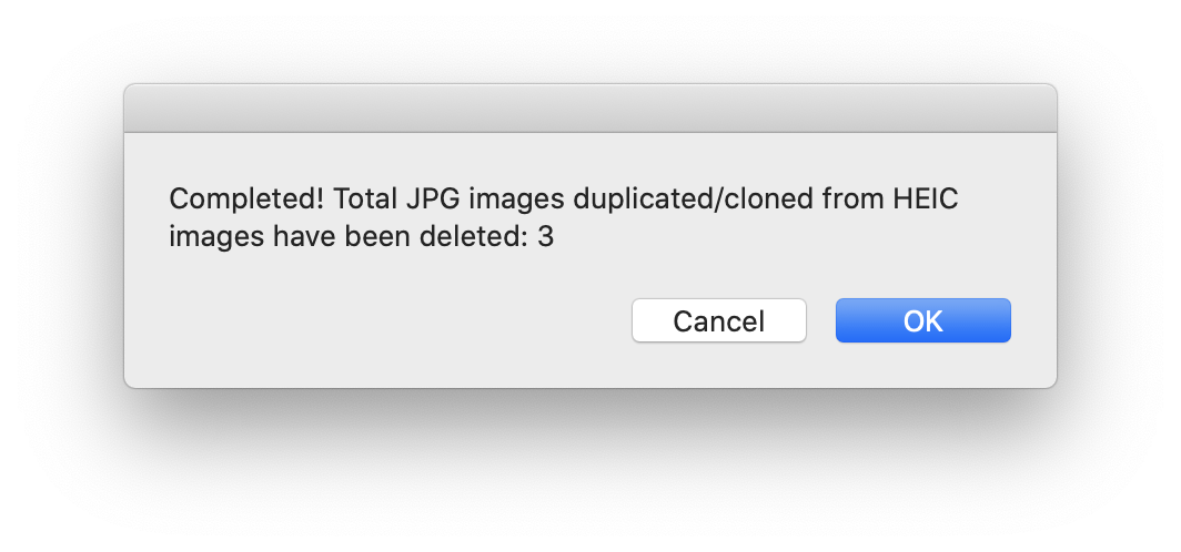 Select the first option if you want to delete the duplicated JPG images and keep the HEIC ones. I prefer this option because JPG are ways heavier than HEIC and this could help saving me a lot of disk space on my Macbook 's SSD. I was able to reclaim about 30GB of free space after removing all duplicated JPG images, which is a lot. In case you want to delete HEIC images and keep the JPG ones, you can select 2nd option