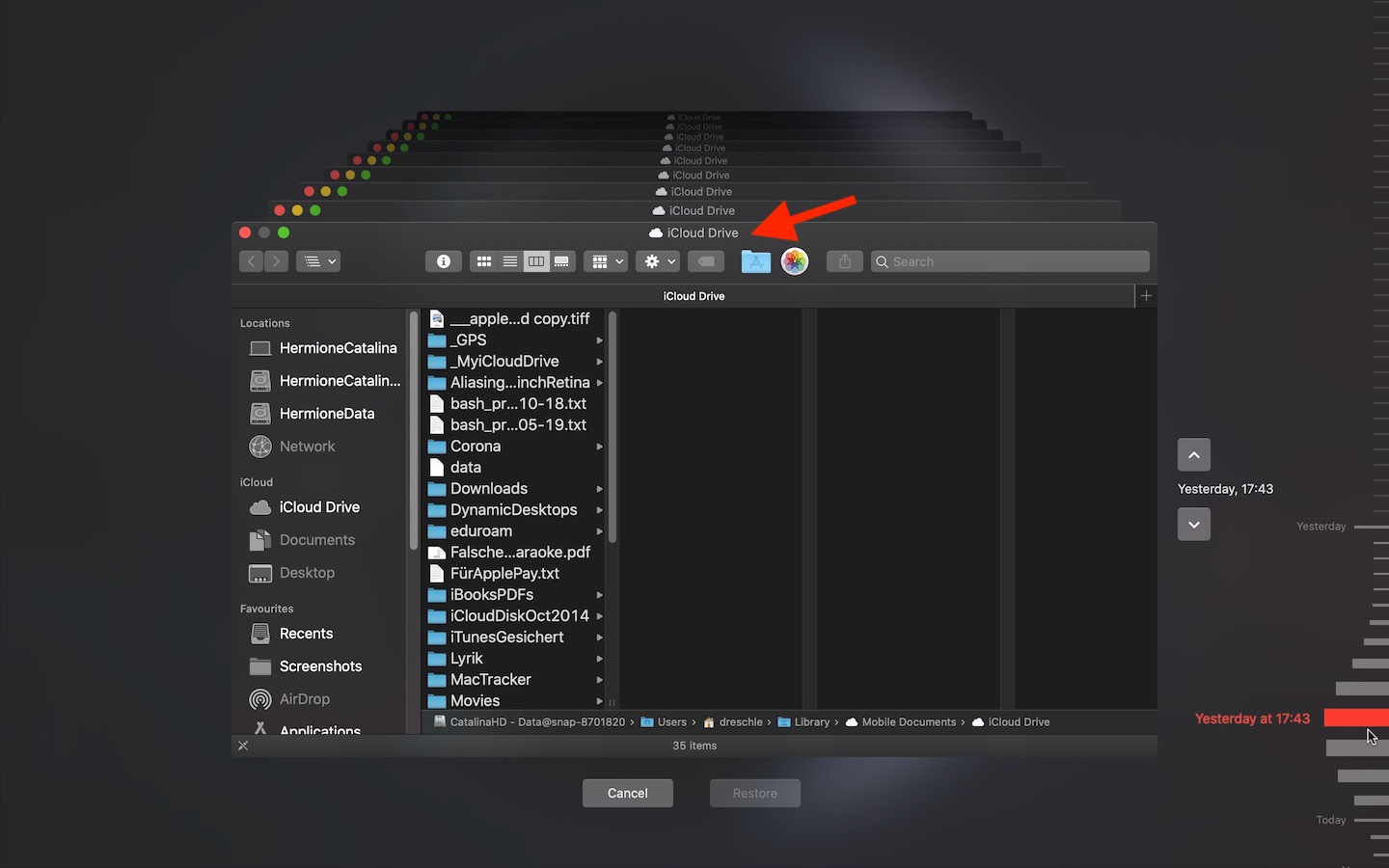 You do not need to search the hidden user library to find the files on iCloud Drive in Time Machine on macOS 10.15 Catalina.