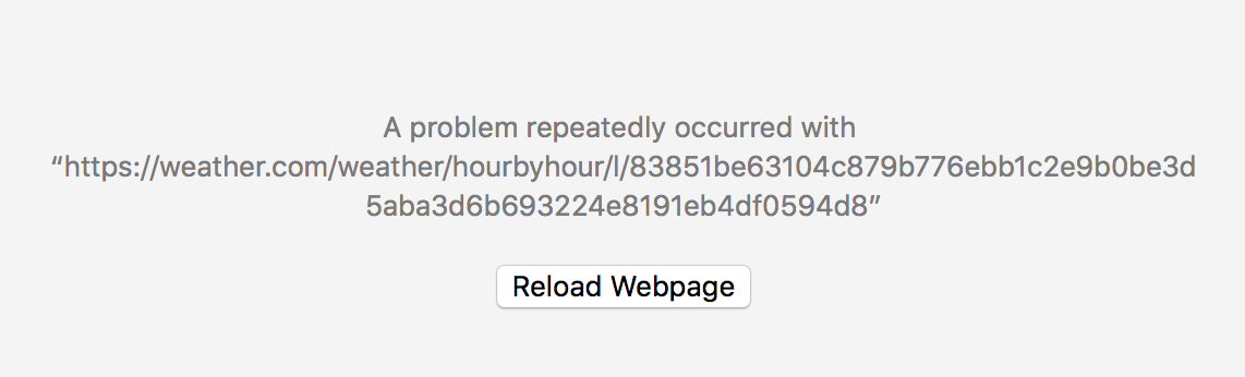 I had been using Safari 13.1 on my MacBook Pro running 10.13.6 High Sierra (I need to stay with that OS for lots of compatibility reasons) for a long time with no significant issues. About a week ago when I go to websites I have visited for years with no issue, the page will try to reload then give an error message "A problem repeatedly occurred...." see attached example screen shot below. There are no issues like this on Firefox or Chrome visiting the same websites or pages. From my searches, I tried to dump cache, history, etc., but nothing I have seen posted on the internet seems to work. HELP!!!