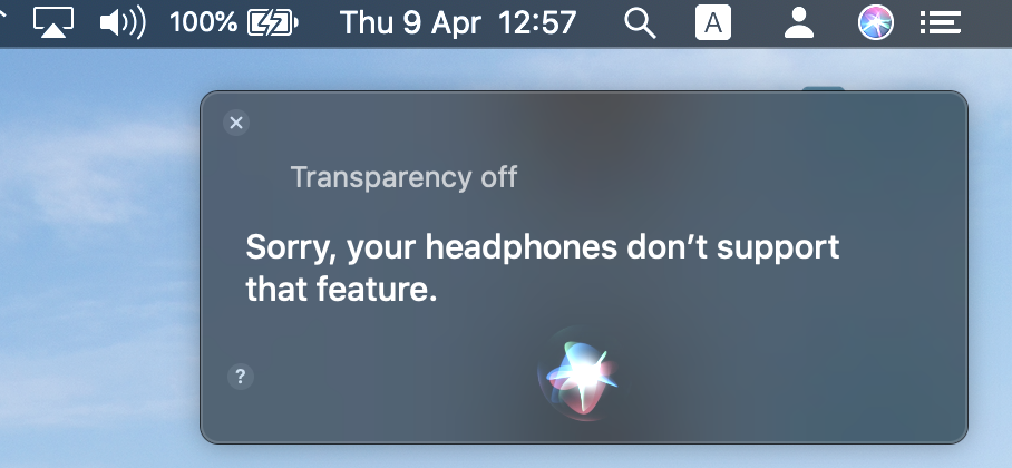 The thing is I can't make Siri to switch Transparency and Noise Cancellation on my AirPods Pro from my Mac.