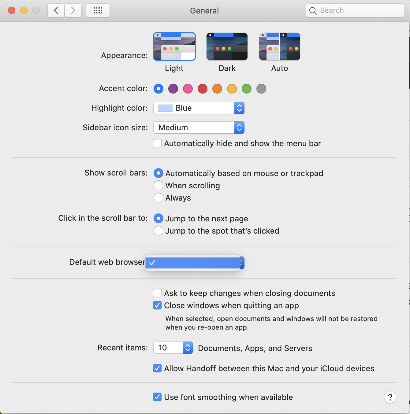 Right now when I click on a link in an email my MacBook Pro opens the window using Chrome instead of Safari. How do I set Safari as the default web browser for links in emails? When I go to the Apple icon then to General and try to select a default web browser from the drop down menu I just get a check mark with no browser options listed.