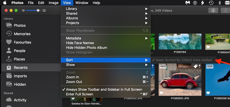 Im macOS 10.15 the Recents album is supposed to be sorted be the date the photo has been added. You can see this, if you look at the menu "View > Sort". For "Recents" this is automatically set to "Oldest date added".