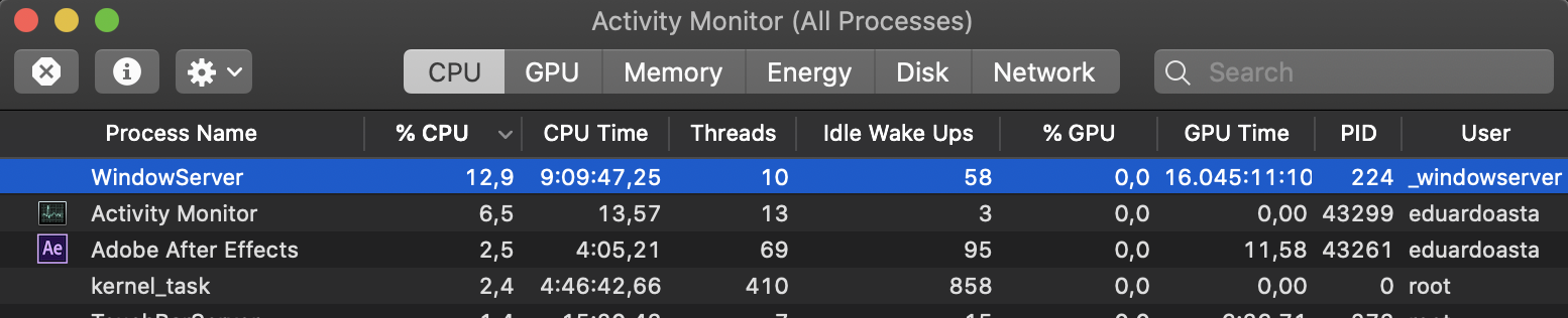 Since I got Catalina installed, the WindowServer process seems to be consuming a lot o CPU power. It consumes more than other apps like After Effects.