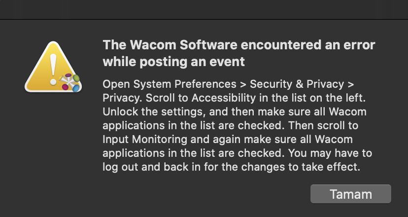 I have bought Wacom Intuos Tablet approximately 1 year ago. It was working really good at the beginning, then i taked a break of digital drawing like 5 or 6 months. I tried to use my tablet 4 days ago, but it didn't worked. It connects my computer, everything is normal but system errors and pen doesn't work. Error says that accessibility isn't checked but i checked it. I uninstalled and installed again the wacom driver and software. Also my mac is installed. I don't know what to do. Looking forward for your answers.