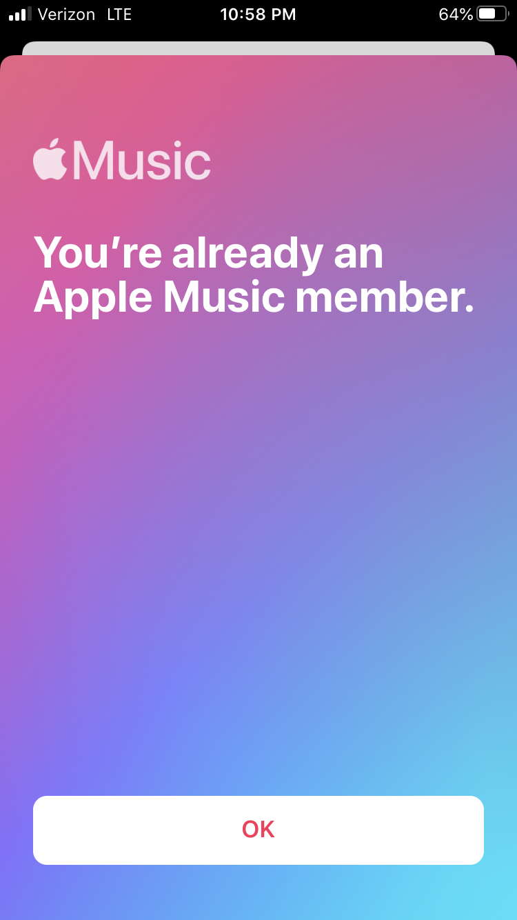 I see you are encountering an error saying you are already a member of Apple Music and due to this are not able to access content.