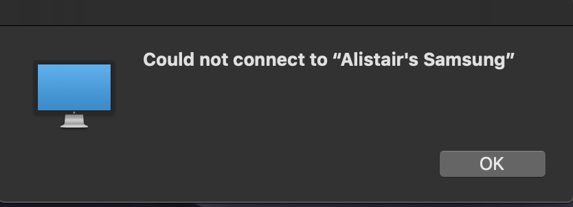 My MacBook Pro has the Airplay symbol at the top with my TV being detected. I have my TV turned on obviously. I click my TV to connect to it and it doesn't do anything for a while. About 30 seconds later, I get the below error message. I have restarted my MacBook and my Samsung TV multiple times and still the same thing. Any help would be much appreciated.