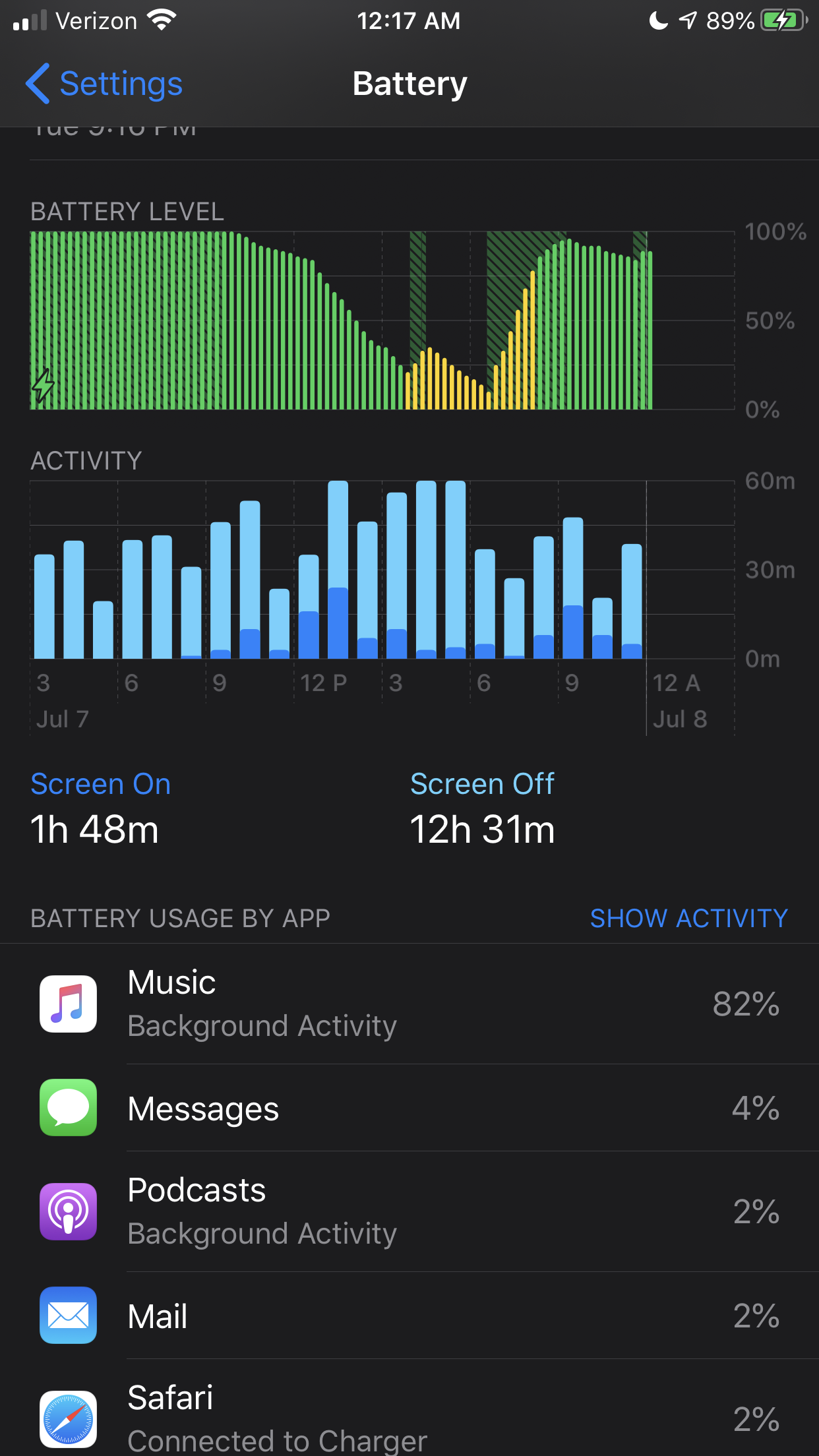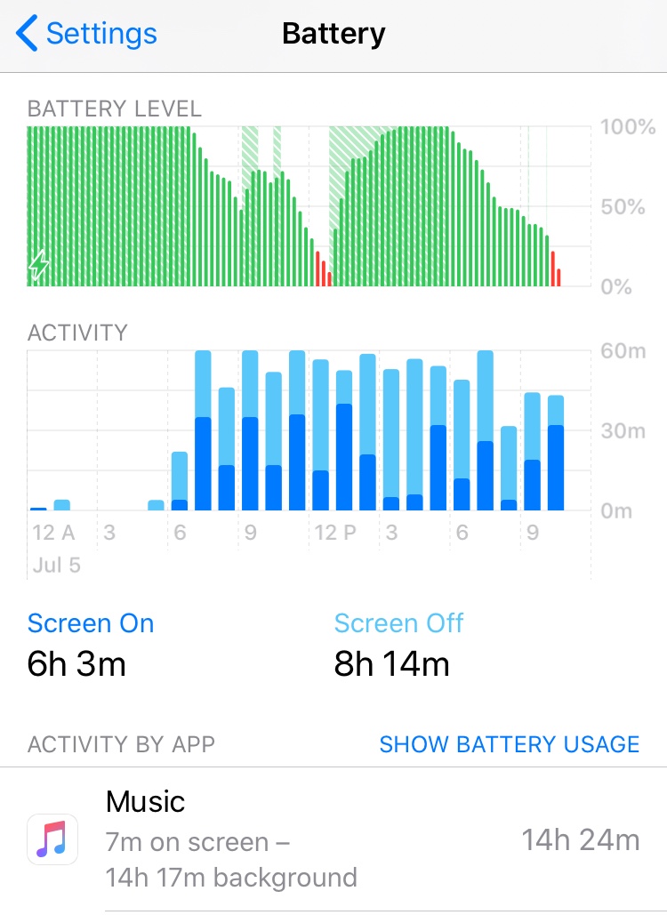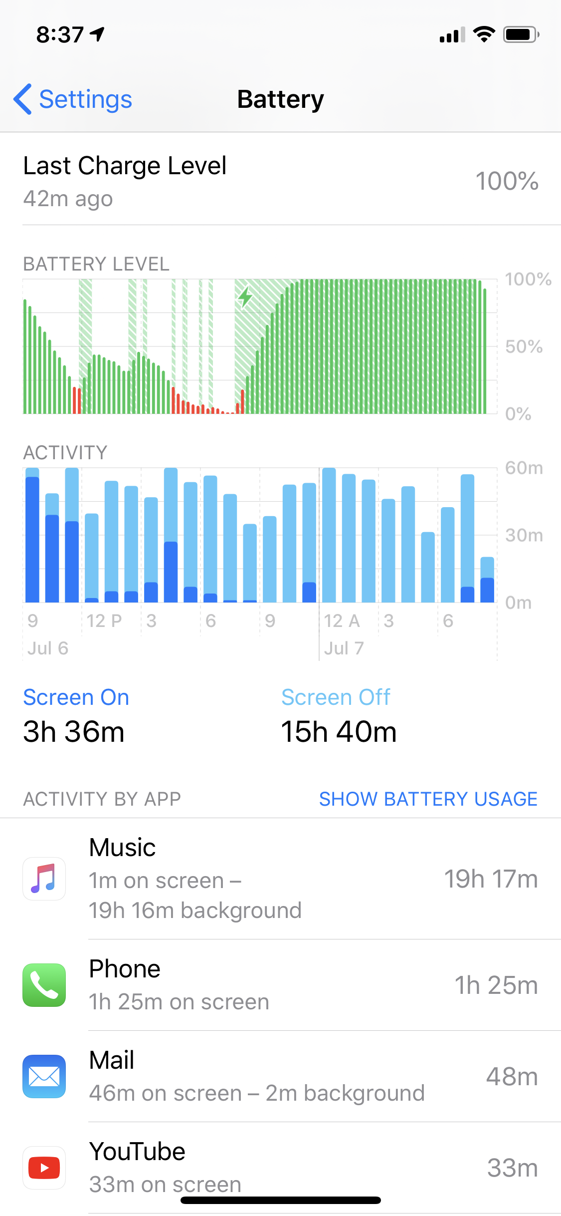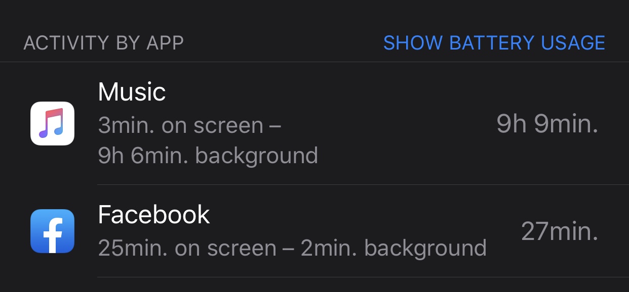 I have an iPhone 8 running IOS 13.4.1 everything is up to date and was performing well until this weekend. All of a sudden my battery started draining much quicker than previously. Looking at the battery usage it seems that Apple Music is causing it. I have attached two screenshots below; one for the last 24hrs and one for the last 10 days. You can see that up until Friday there was little or no background activity however this jumps massively over the weekend. I have turned background app refresh off for all app and yet Apple Music is still draining the battery when not in use; 53% of battery use in the last 24hrs without using the app.