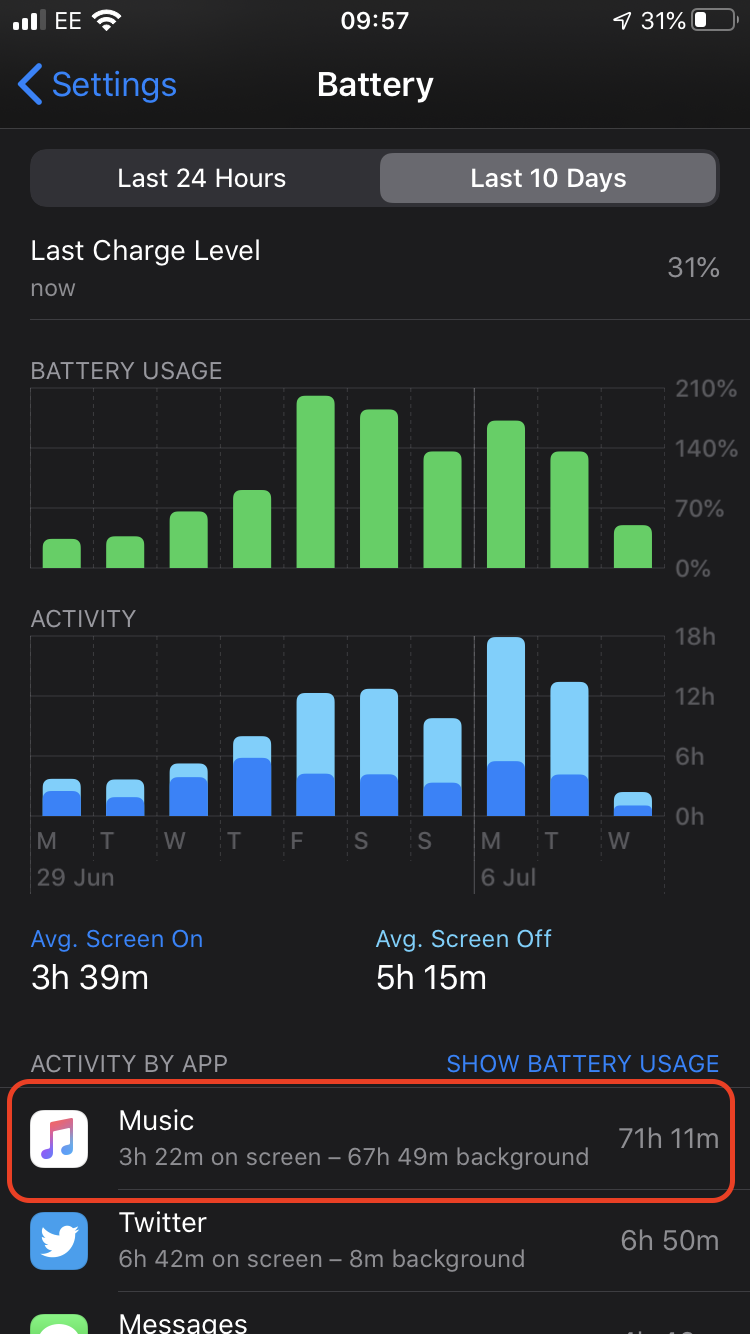 I have an iPhone 8 running IOS 13.4.1 everything is up to date and was performing well until this weekend. All of a sudden my battery started draining much quicker than previously. Looking at the battery usage it seems that Apple Music is causing it. I have attached two screenshots below; one for the last 24hrs and one for the last 10 days. You can see that up until Friday there was little or no background activity however this jumps massively over the weekend. I have turned background app refresh off for all app and yet Apple Music is still draining the battery when not in use; 53% of battery use in the last 24hrs without using the app.
