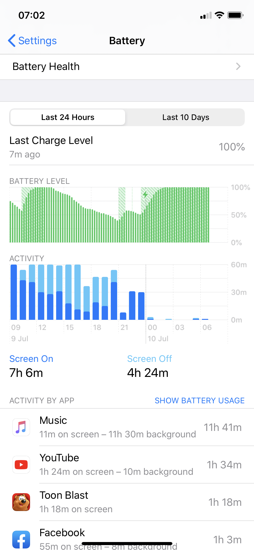 I have an iPhone 8 running IOS 13.4.1 everything is up to date and was performing well until this weekend. All of a sudden my battery started draining much quicker than previously. Looking at the battery usage it seems that Apple Music is causing it. I have attached two screenshots below; one for the last 24hrs and one for the last 10 days. You can see that up until Friday there was little or no background activity however this jumps massively over the weekend. I have turned background app refresh off for all app and yet Apple Music is still draining the battery when not in use; 53% of battery use in the last 24hrs without using the app.
