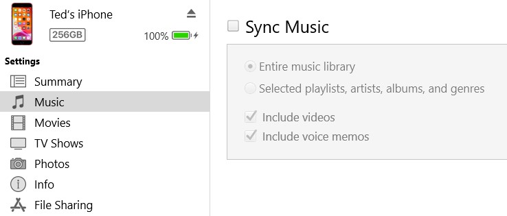 Put a check mark in the Sync Music box, and the others will come to life. Then select whatever options you want.