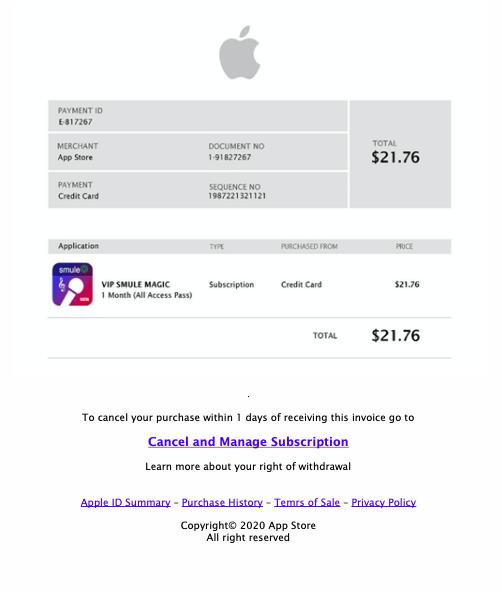 I feel this may be a spam/phishing email, but it's the second time I've gotten it. I check all of my accounts and had my spouse do the same. We haven't seen this charge, but are still concerned. They didn't ask for any info. Looks just like a bill, but neither o us show this in our subscriptions and we don't have the app.